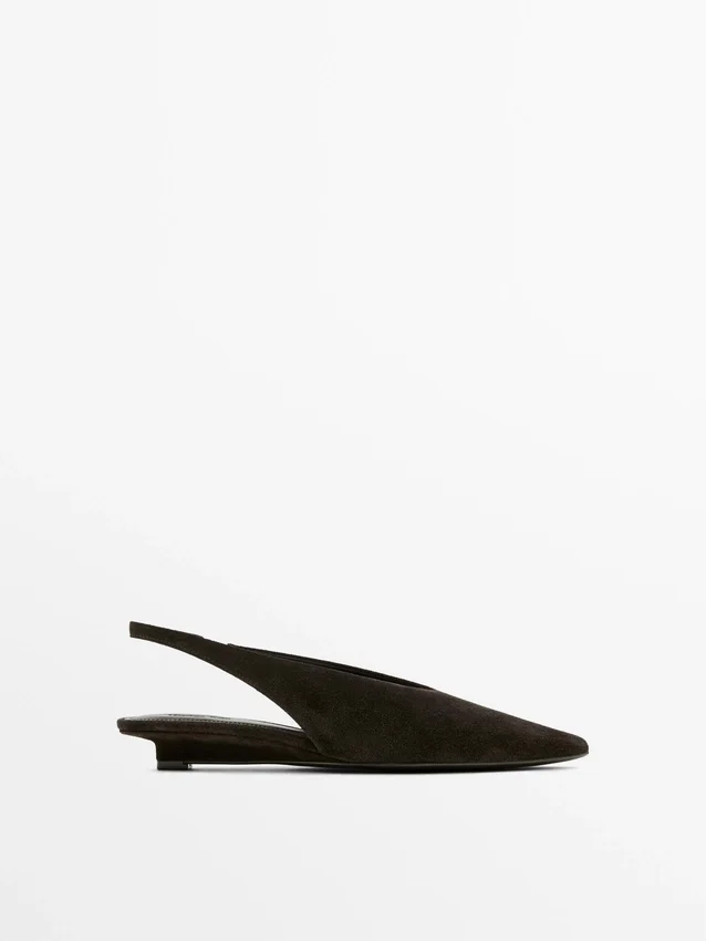Tillverkad av nötläder med mockafinish. Elastisk rem baktill. Öppen bakdel. Foder och innersula i läder. Klack: 2 cm.
