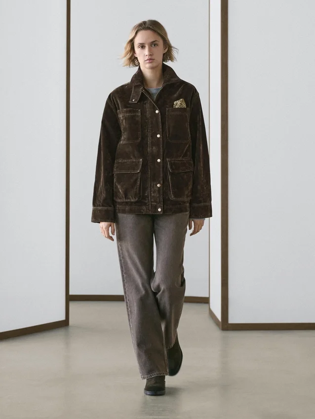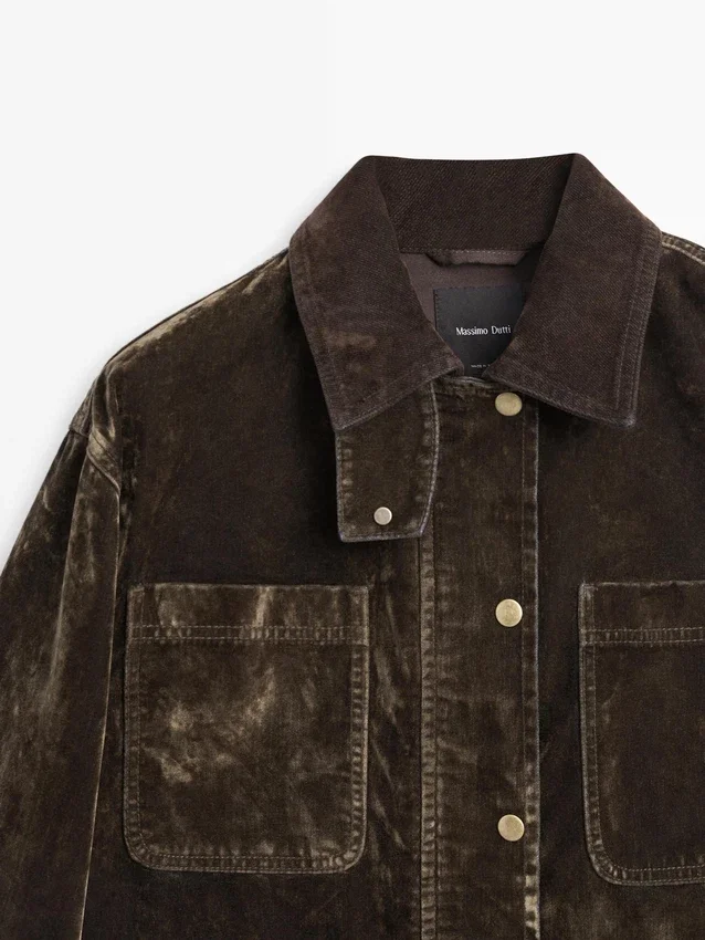 Jeansjacka. Långa ärmar med knäppta manschetter. Dold dragkedja med knäppning. Fyra påsydda fickor. Flockad yta, sammetslen effekt, mjuk att ta på. Krage.