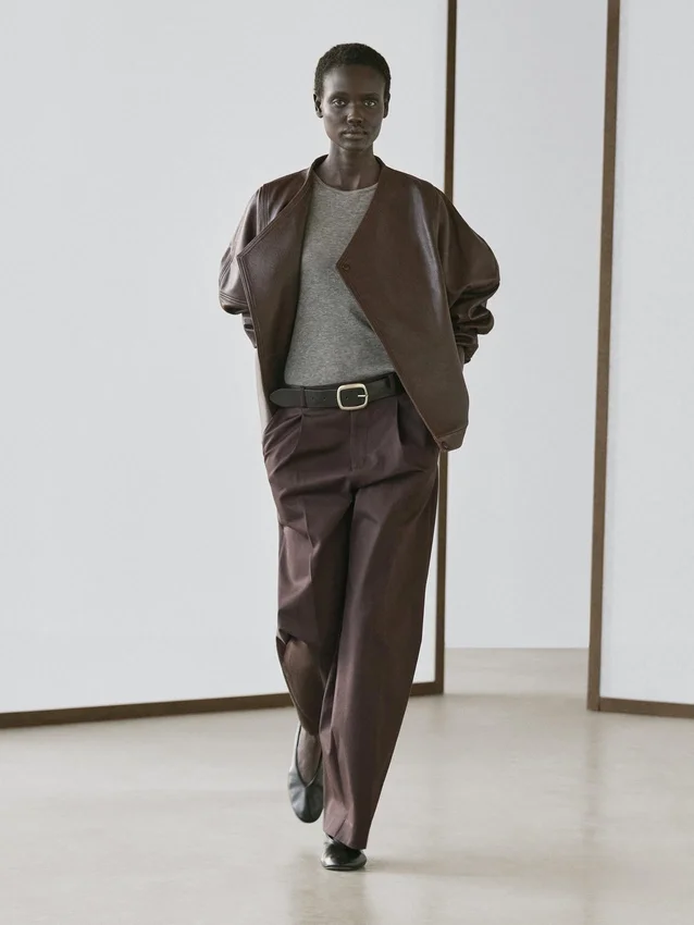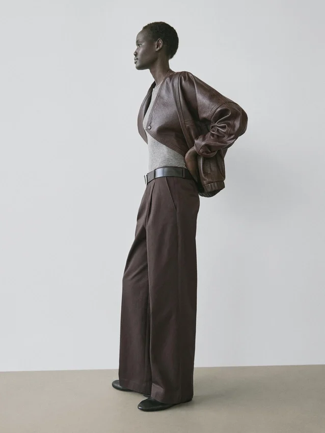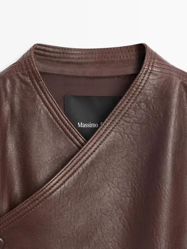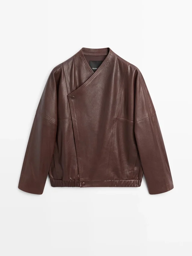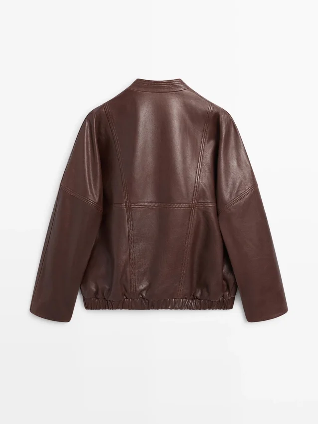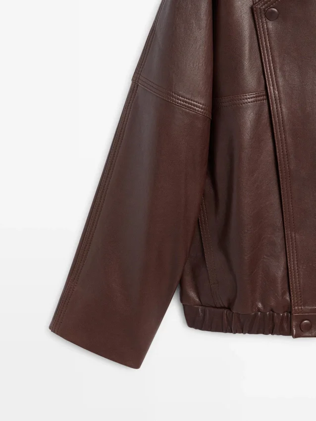 Bomberjacka. Långa ärmar. Elastisk midja. Korslagd knäppning med dragkedja och dubbla knappar. Två sidfickor. Tillverkad av nötläder.