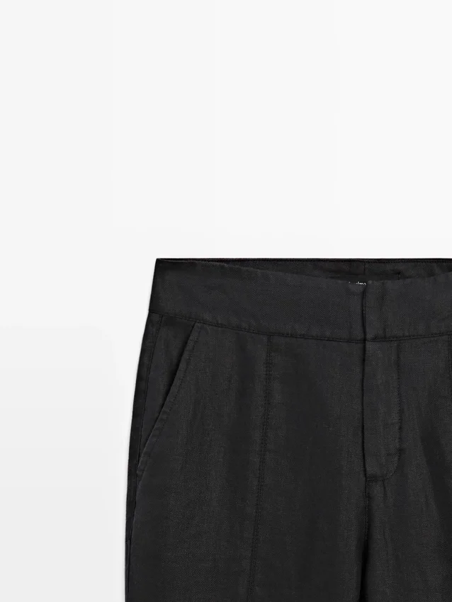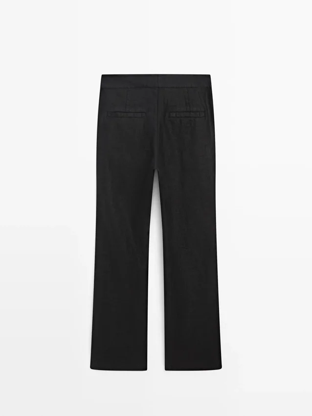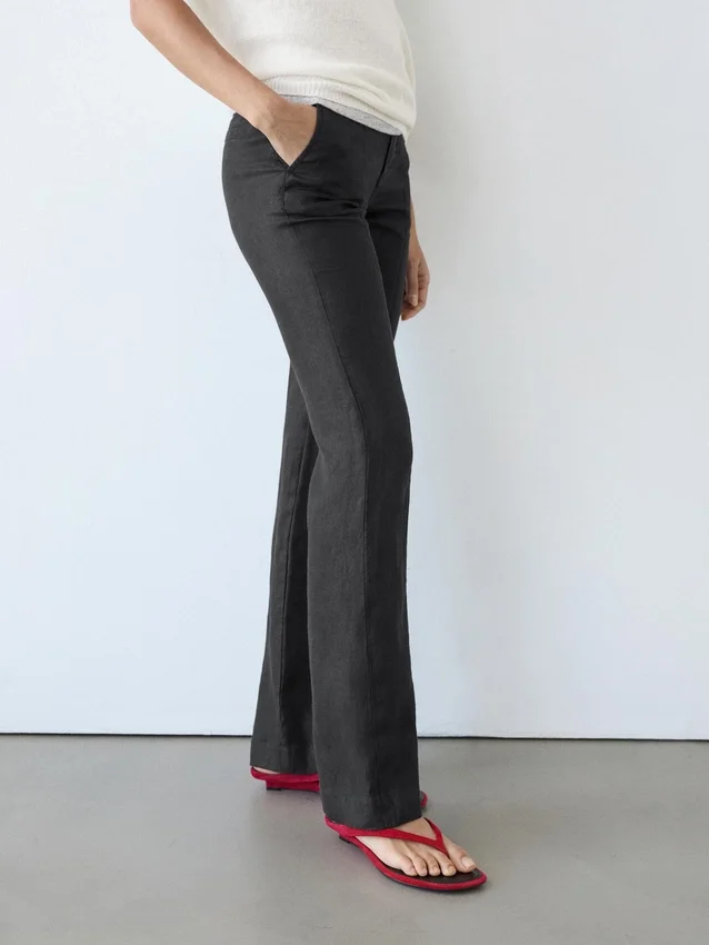 Kick Flare-byxor: Lätt utsvängda och ankelånga. Dragkedja och hake-och-öga-knäppning med knapp på insidan. Två sidfickor. Två passpoalfickor på baksidan. Detalj med mittsöm. Tillverkade av 100 % linne.