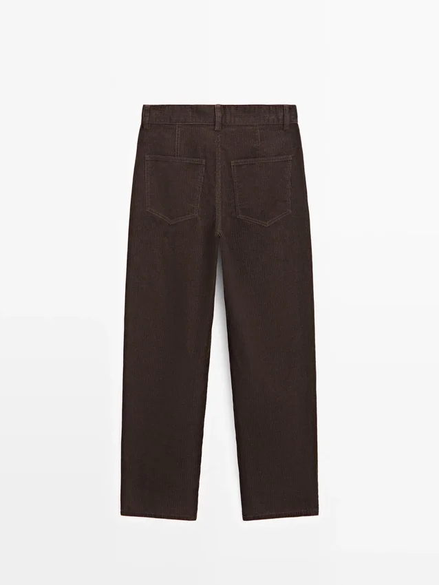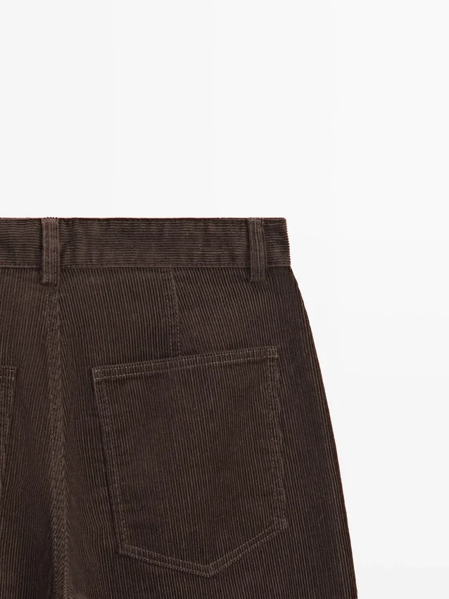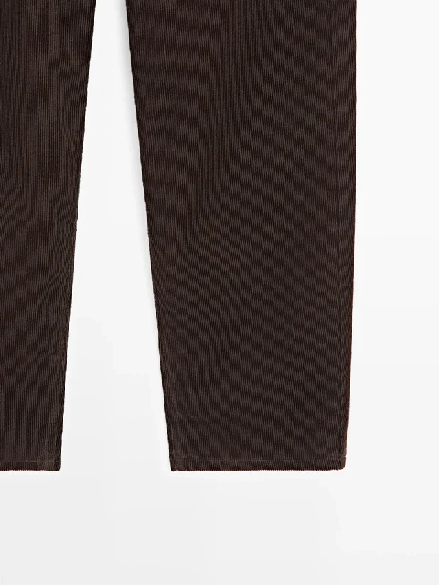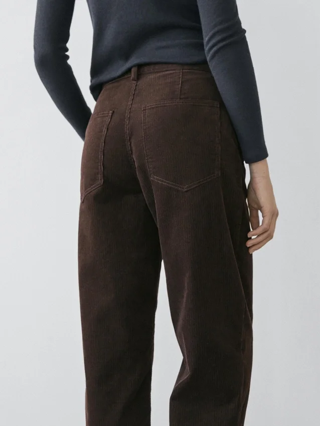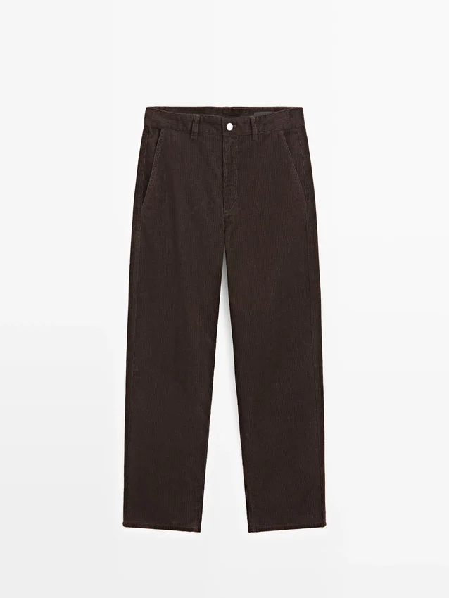 Byxor med barrel-passform: Denna passform har en bredare form vid låren och smalare ben mot fotleden, en mellanpassform mellan slim och regular. Dragkedja fram och knäppning upptill. Två påsydda fickor bak. Två sidfickor. Tyg med corduroy-effekt.