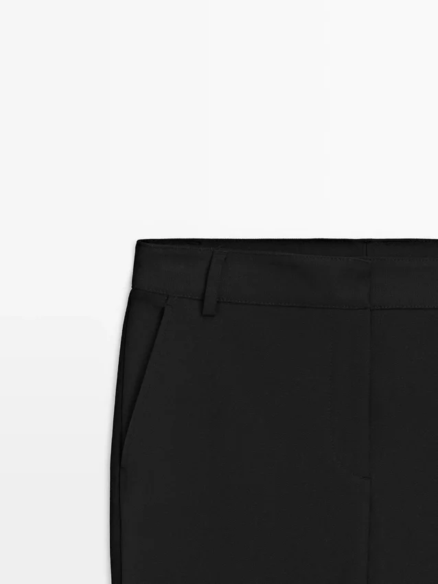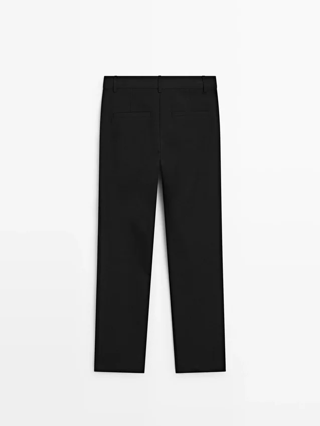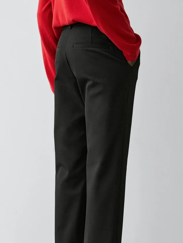 Byxor med raka ben tillverkade av tekniskt tyg. Dragkedja dold av en knäppning, knapp på insidan. Två sidfickor. Två passfickor på baksidan. Stretchtyg.