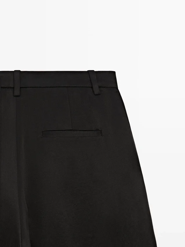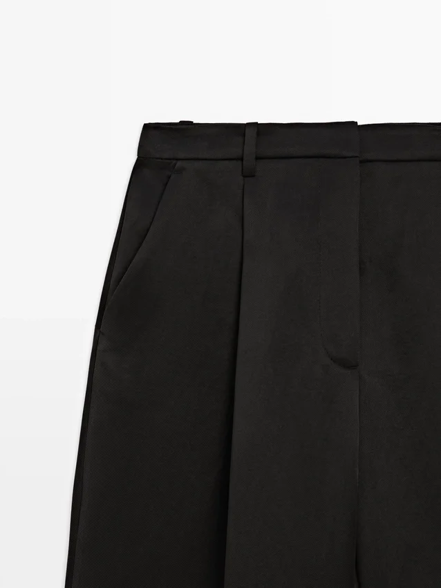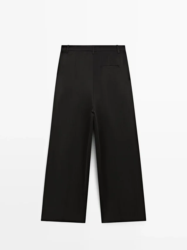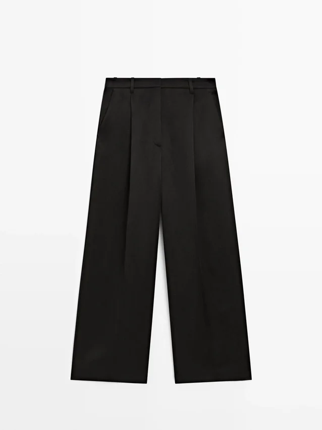 Byxor i flödande tyg. Midjeband med hällor. Dragkedja dold av en knäppning, knapp på insidan. Två sidfickor. En passficka bak. Plisseringar fram.