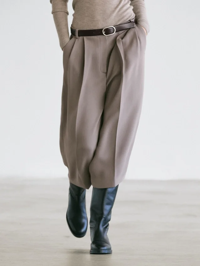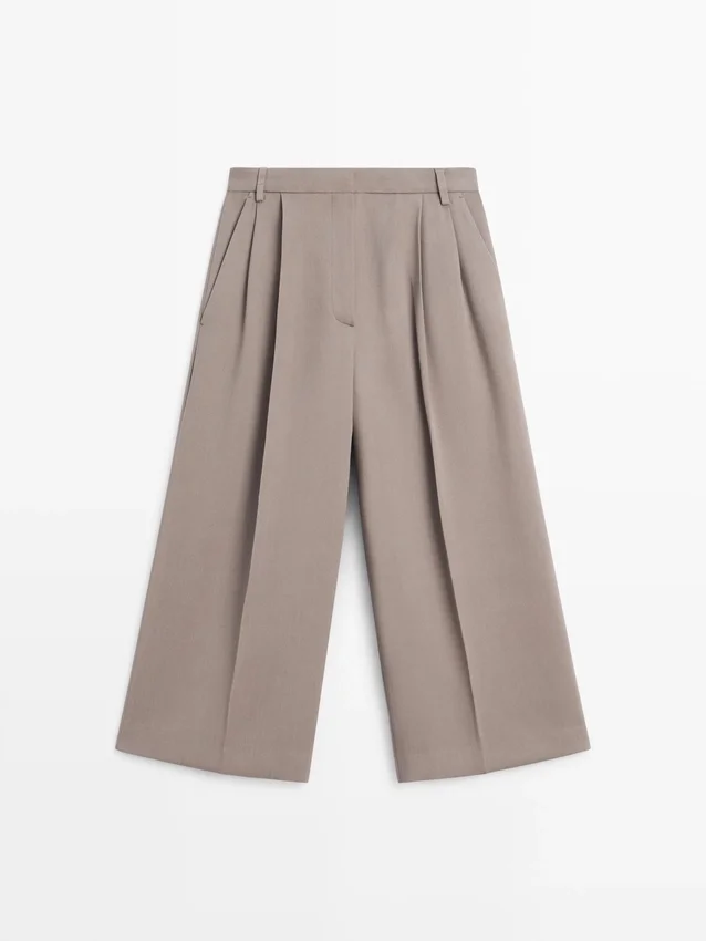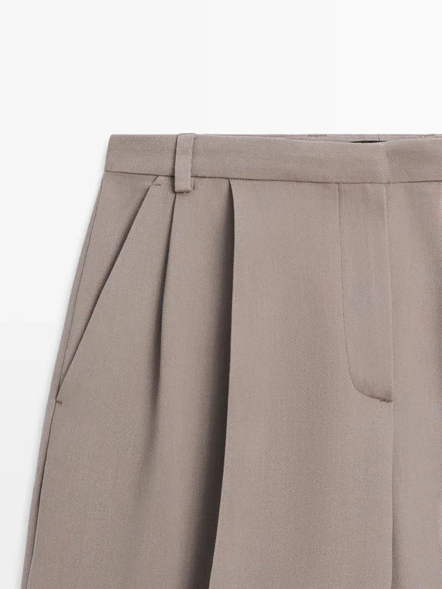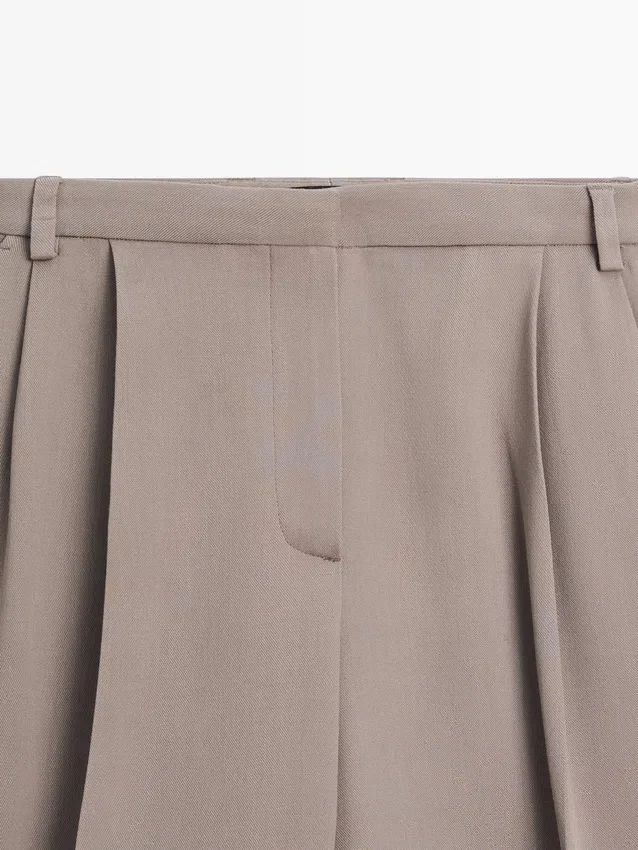 Långa bermuda-shorts i flödande tyg. Midjeband med hällor. Dragkedja dold av en knäppning, med hake-och-öga-spänne och knapp. Två sidfickor.