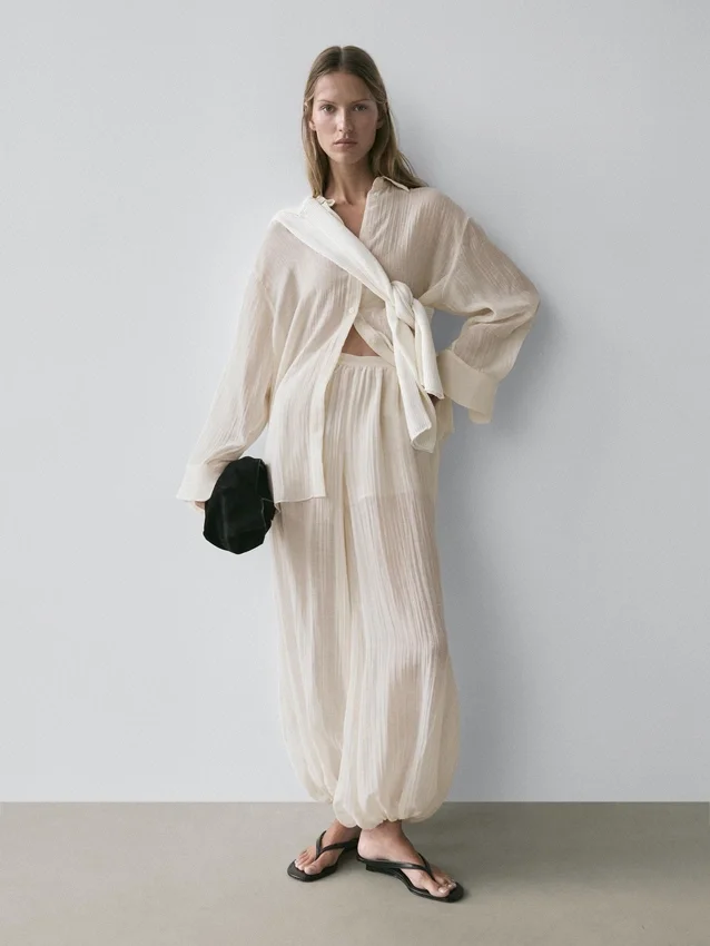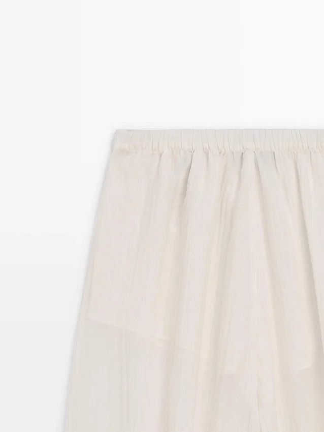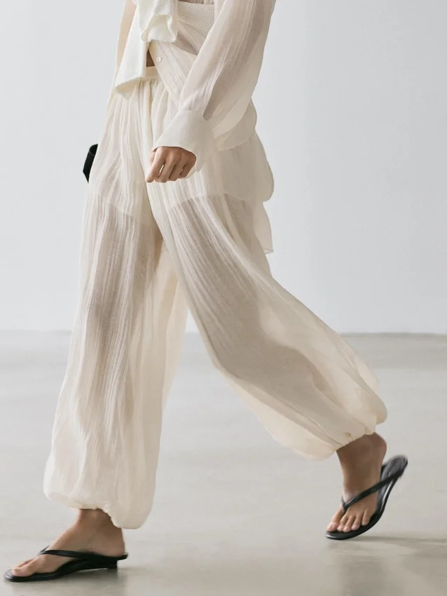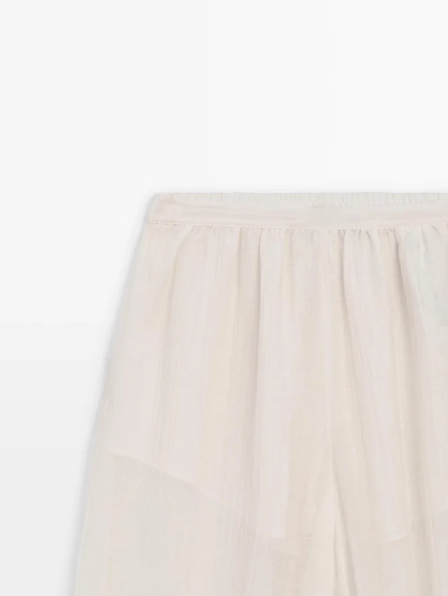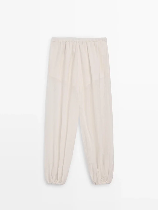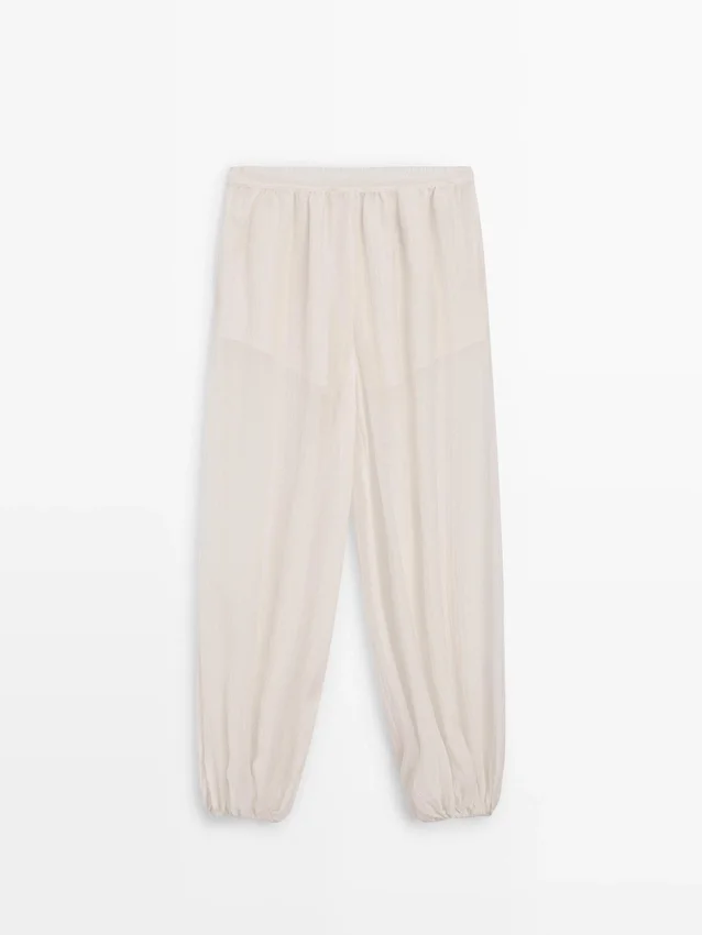 Byxor tillverkade av flödande plisserat tyg. Elastisk midja. Elastiskt band i nederkanten. Halvtransparent tyg. Matchande plagg finns.