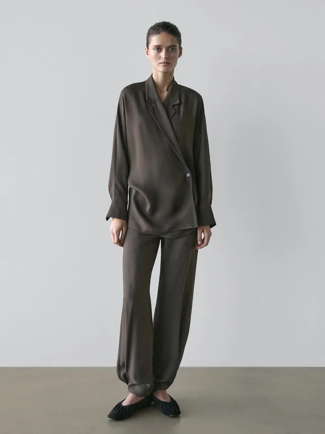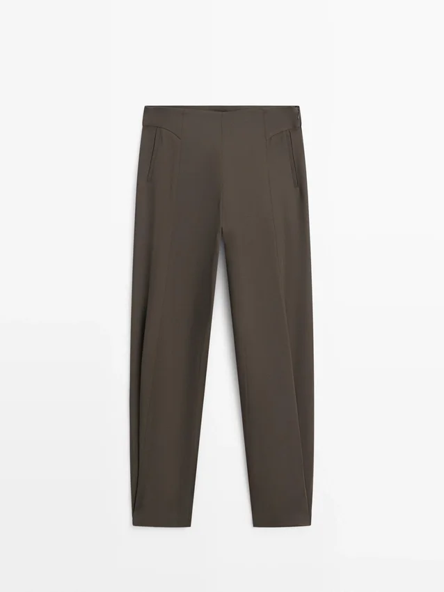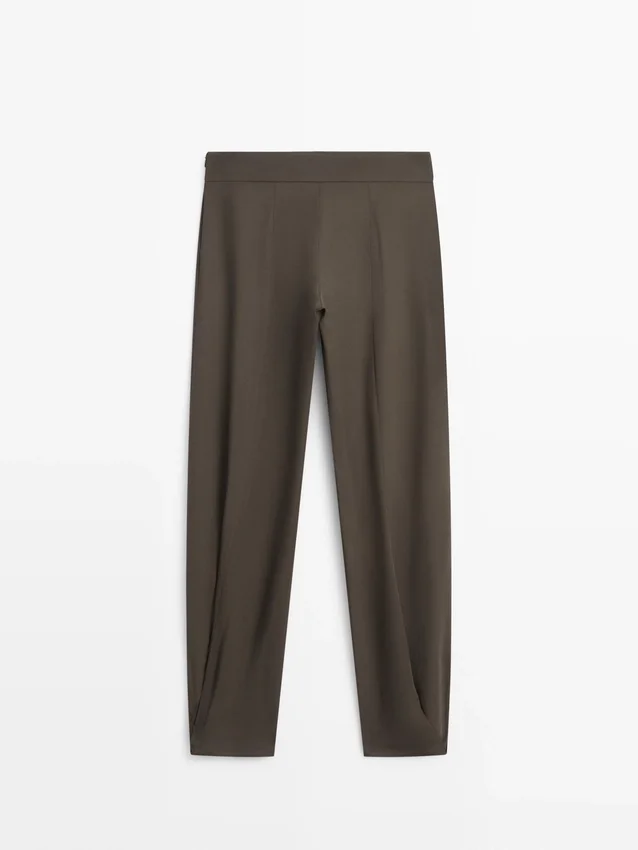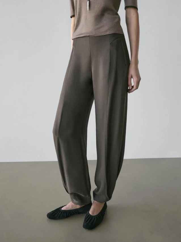 Sarouelbyxor: Löst sittande silhuett, vid ben och ankellång passform. Dragkedja i sidan. Två sidfickor. Insnitt på framsidan. Matchande plagg finns.