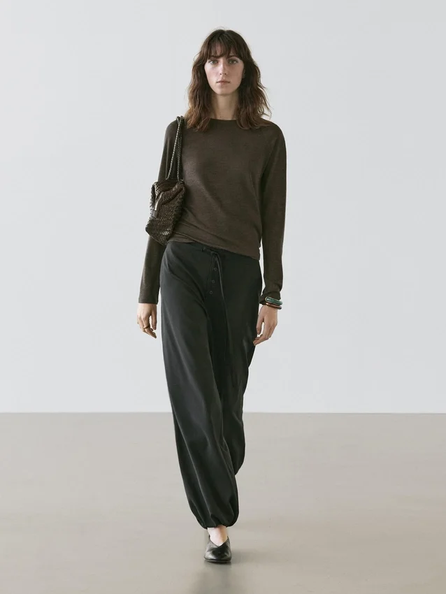 Sarouelbyxor: Löst sittande silhuett, vid ben och ankellängd. Knäppning fram. Ögla i midjan. Justerbar elastisk fåll. Två sidfickor.Material