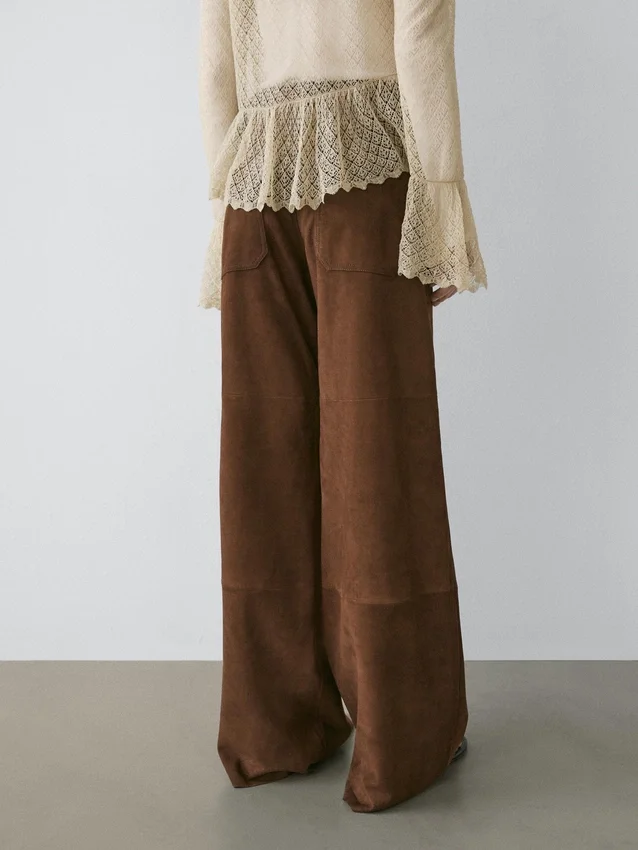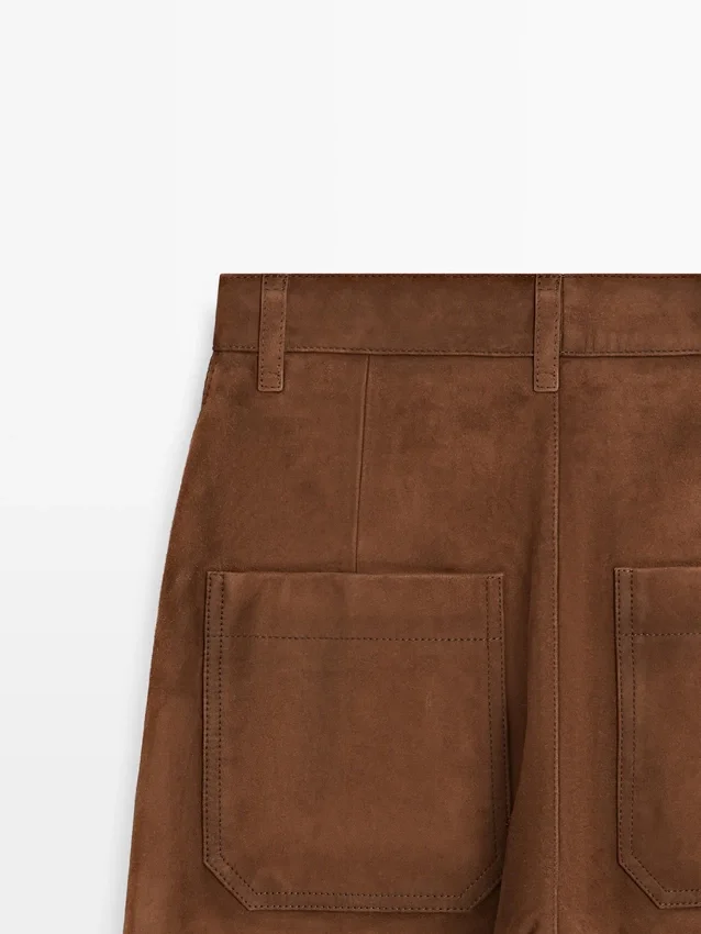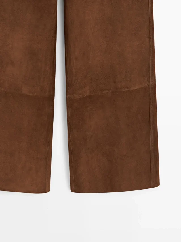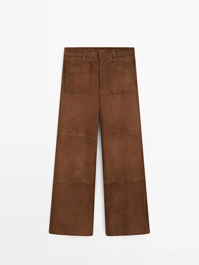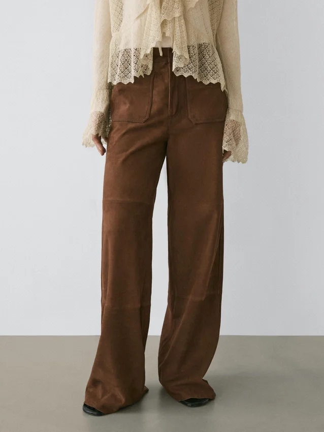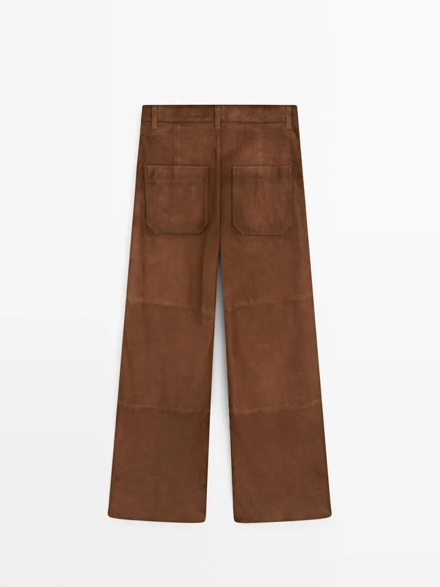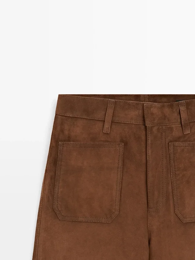 Byxor tillverkade av getskinn med mockafinish. Midjeband med bälteshällor. Dragkedja fram och knäppning upptill. Två påsydda fickor bak. Två påsydda fickor. Fodrade.
