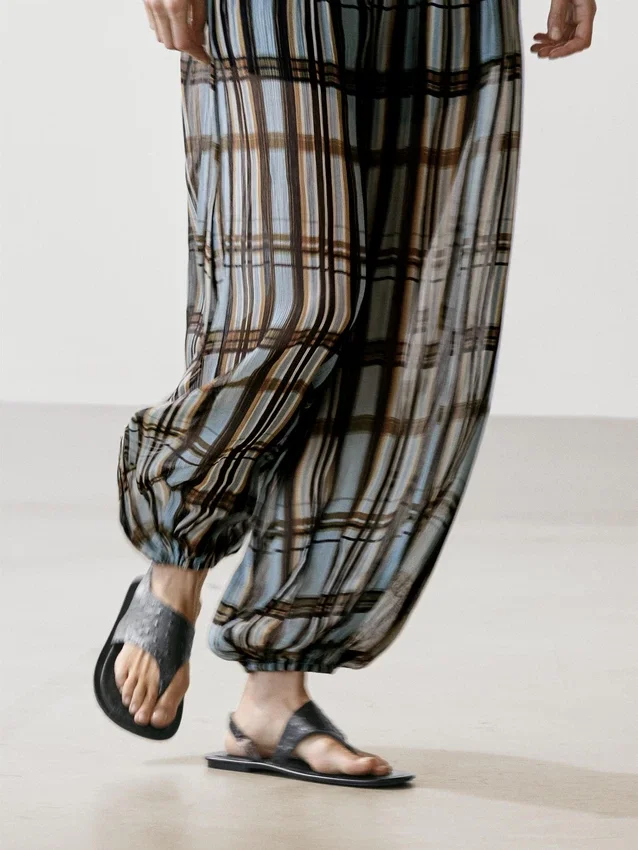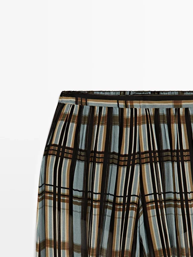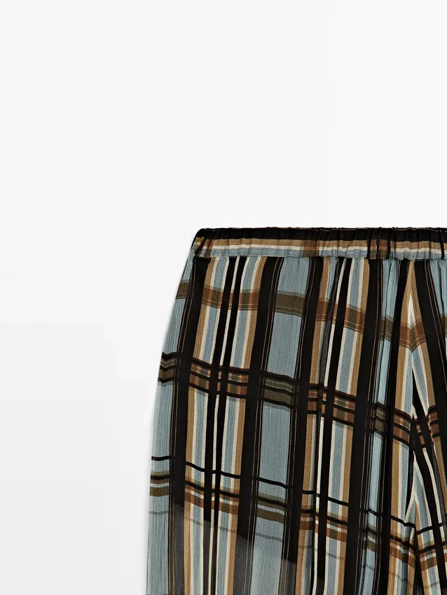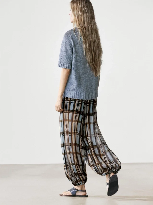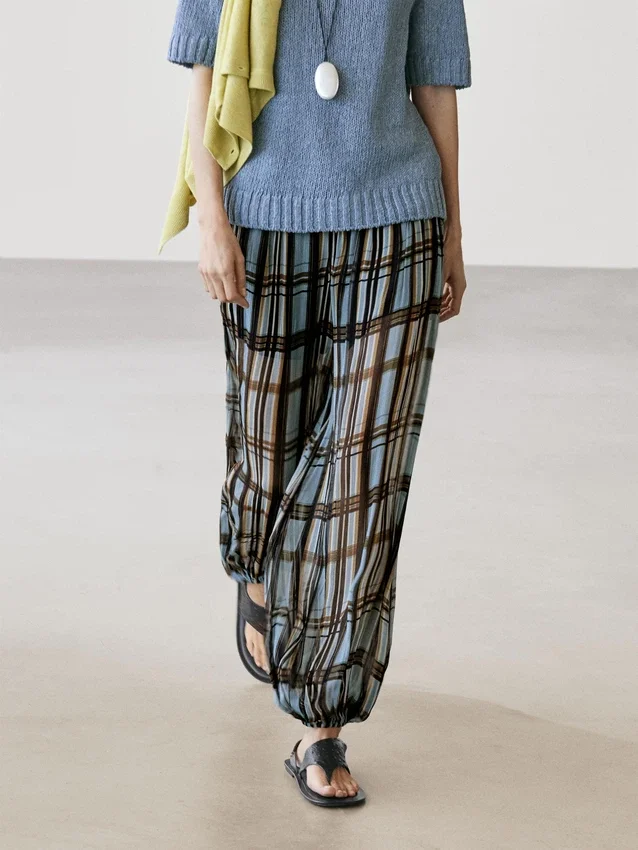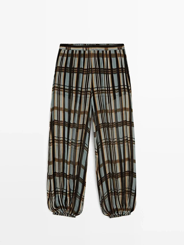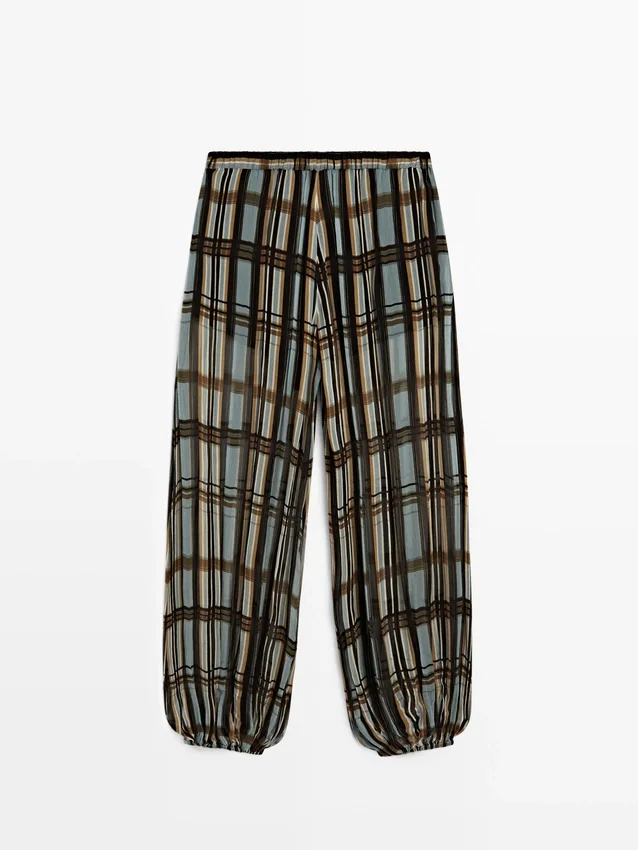 Sarouel-byxor: Löst sittande passform, vid ben och smalare vid fotleden. Dragkedja i sidan. Elastisk midja baktill. Två sidfickor. Rutmönster. Elastisk kant nedtill. Fodrad.Material
