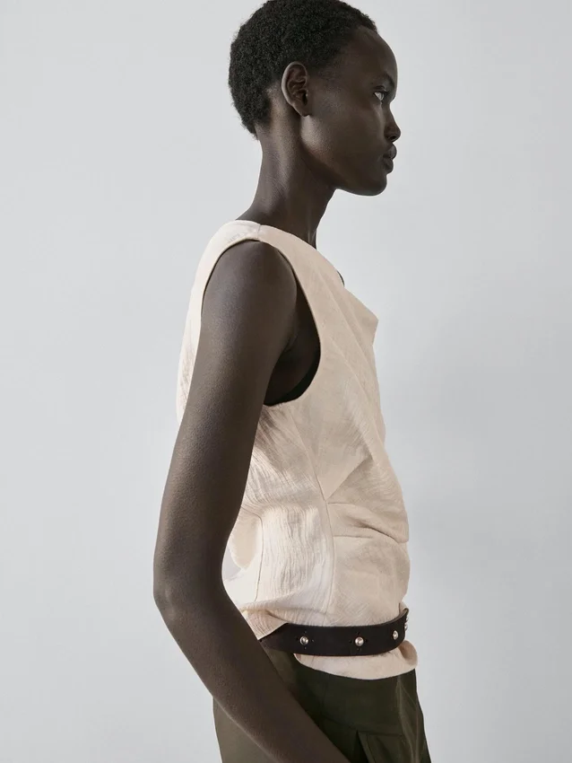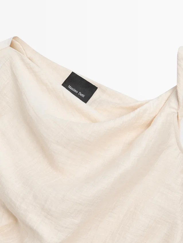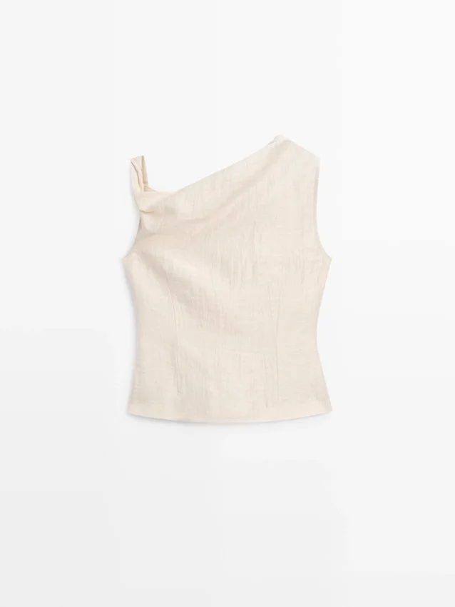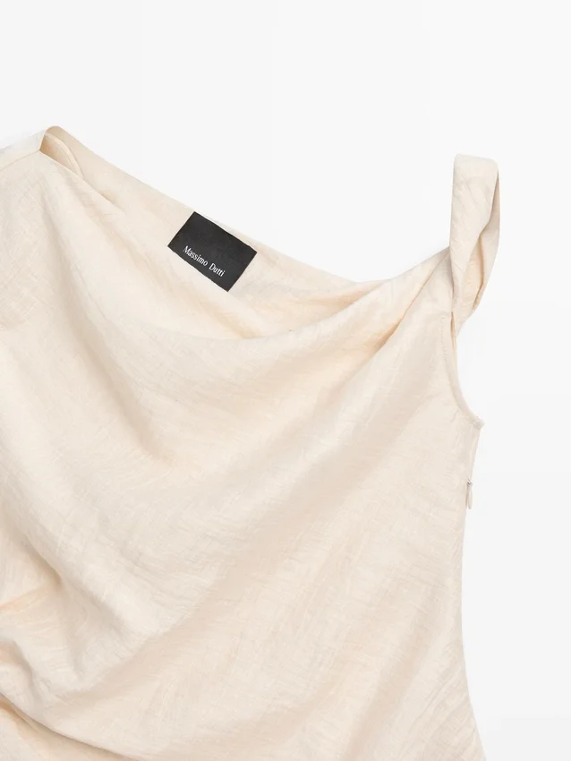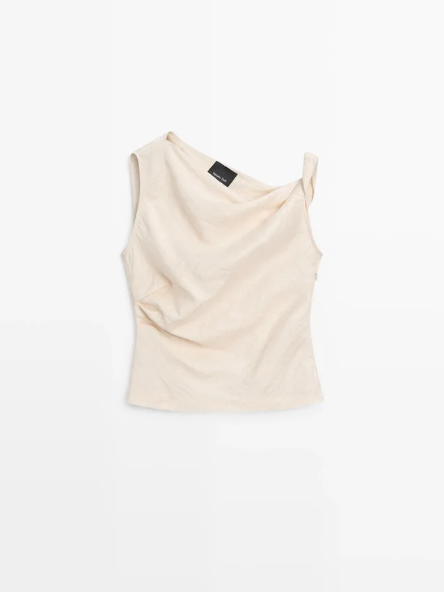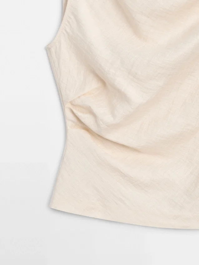 Asymmetrisk topp med draperade detaljer. Ärmlös. Knutdetalj. Matchande plagg finns.