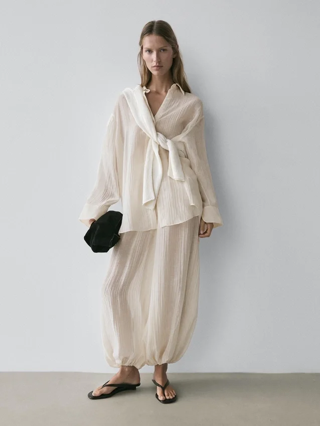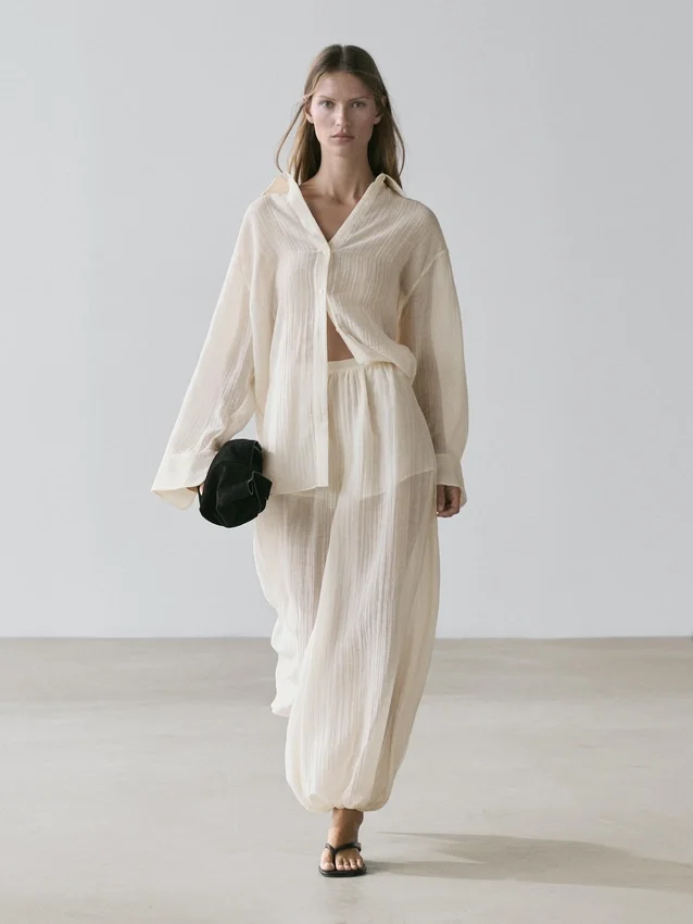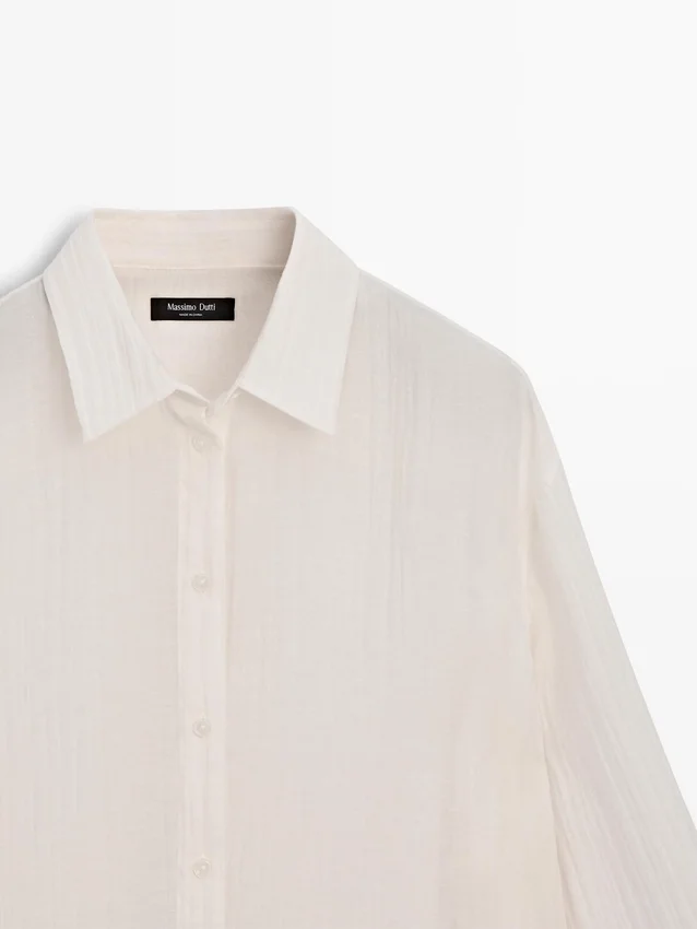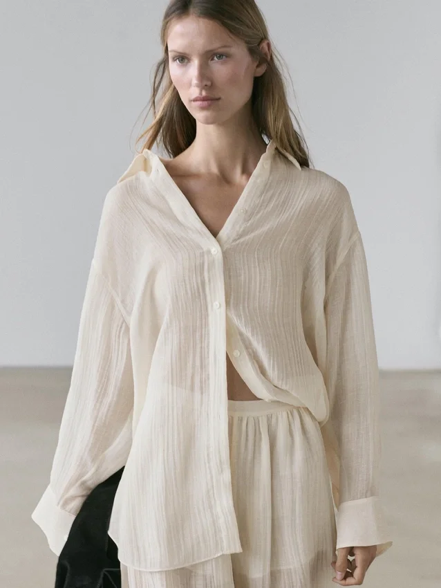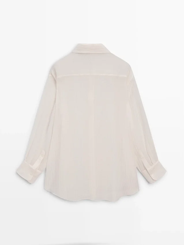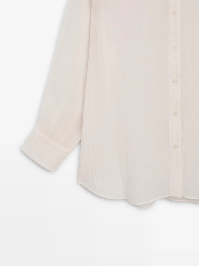 Flödande skjorta. Långa ärmar med knäppta manschetter. Skjortkrage. Knäppning fram. Extrafint, halvtransparent tyg. Matchande plagg finns.Sammansättning