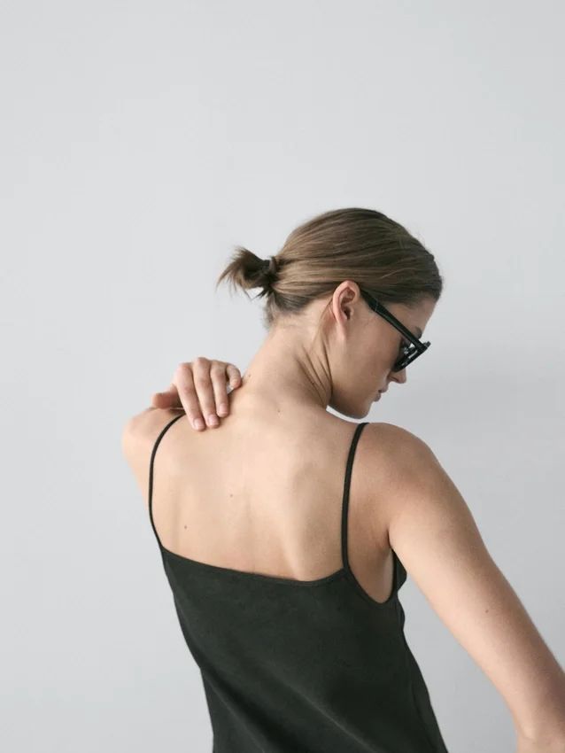 Klänning tillverkad av 100 % linne. Rak halsringning. Spaghettiband. Sidoslits i nederkant.