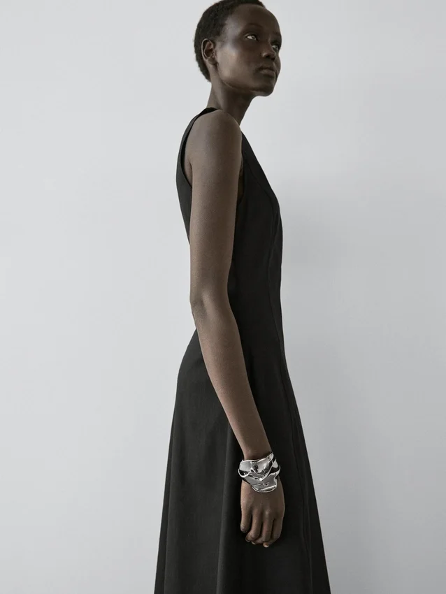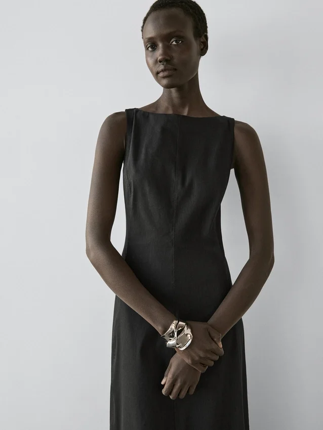 Lång klänning tillverkad av linne. Halterneck. Ärmlös. Dragkedja i ryggen.