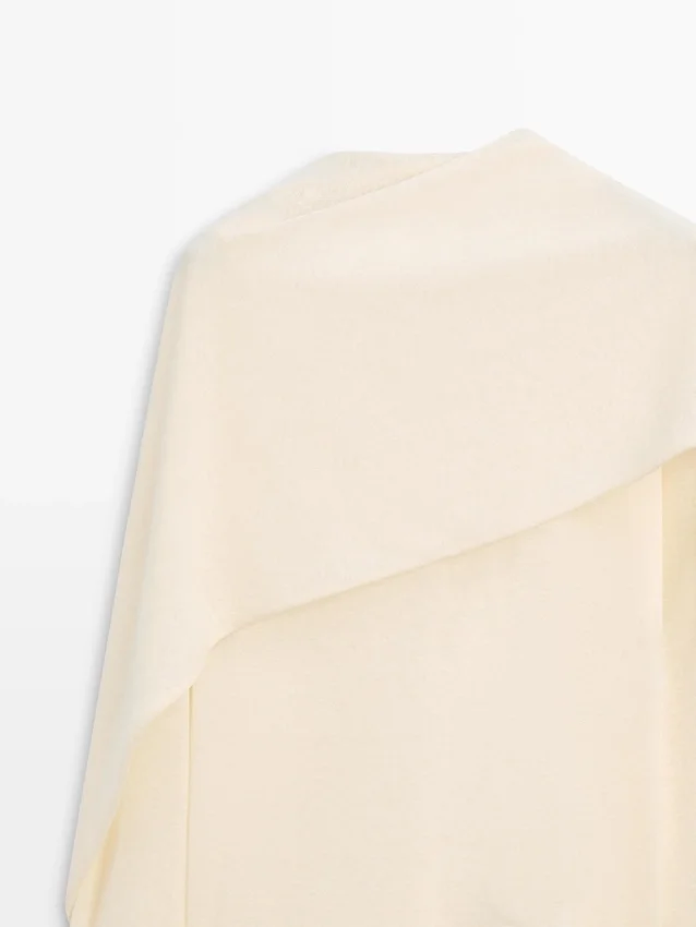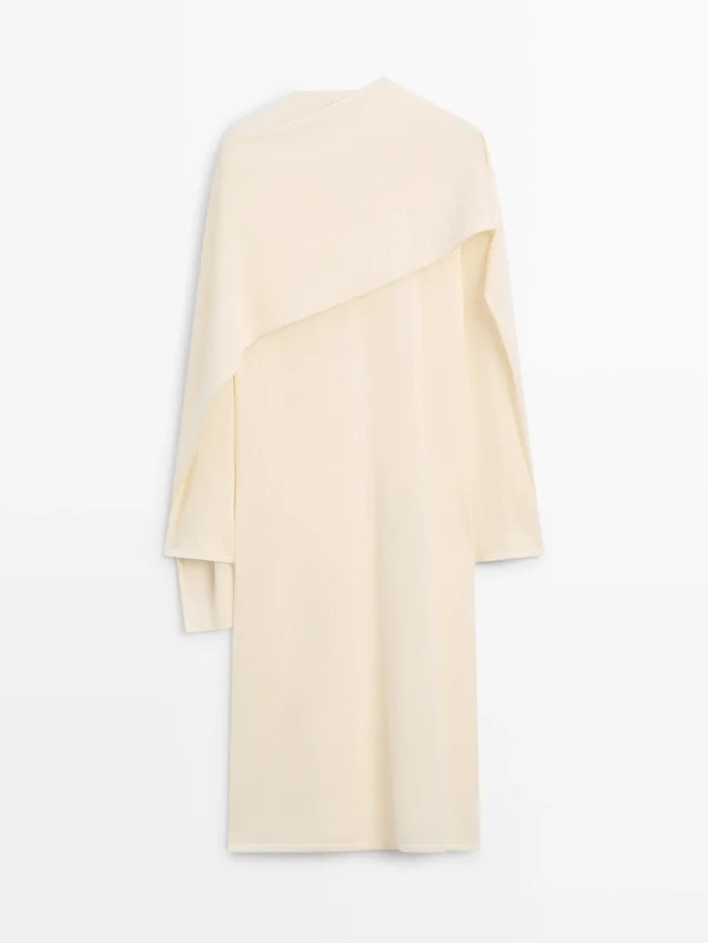 Lång klänning. Rund hals. Långa ärmar. Fint, lätt tyg. Matchande plagg finns. Kappan är inte avtagbar, den är stickad som en del av tröjan.