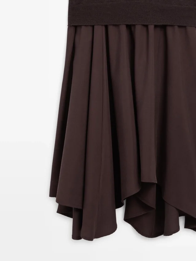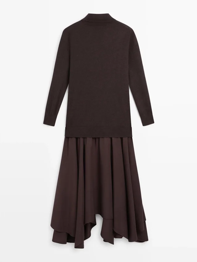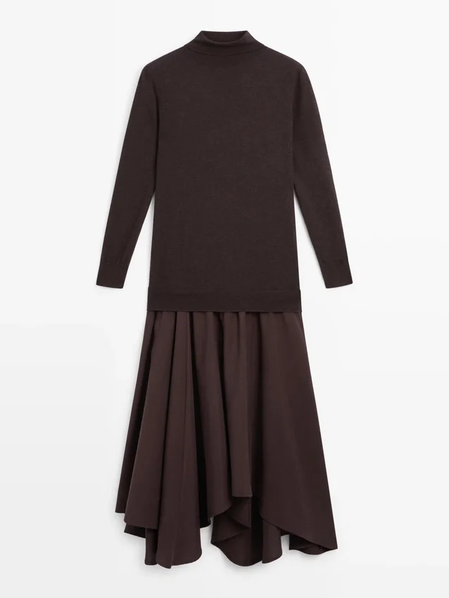 Midiklänning med utställd kjol och stickad överdel. Långa ärmar. Hög krage.