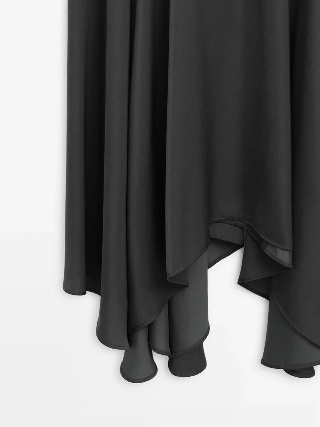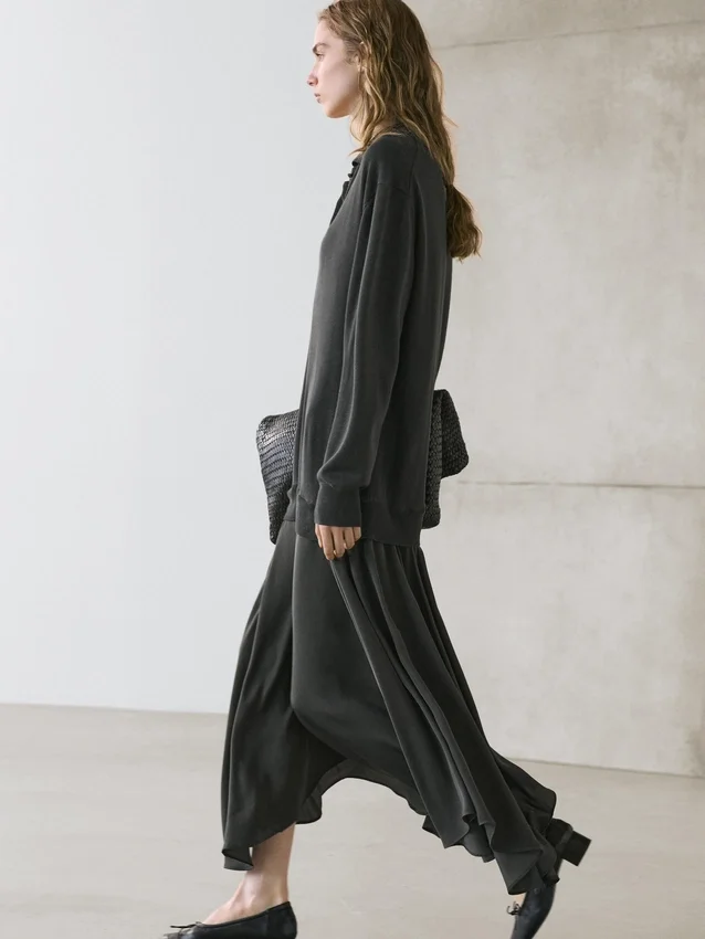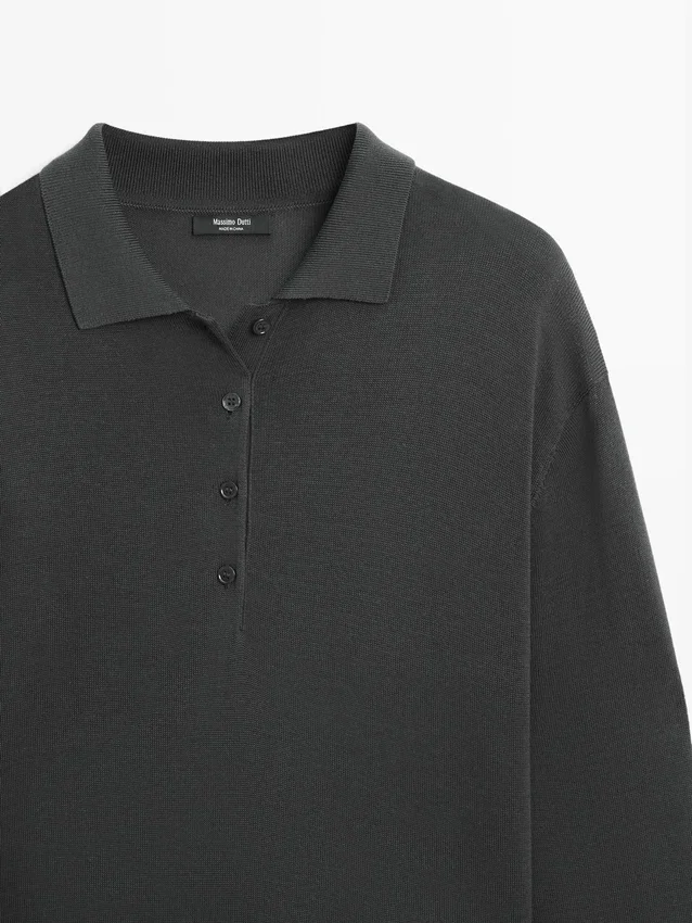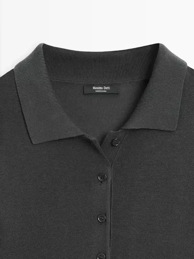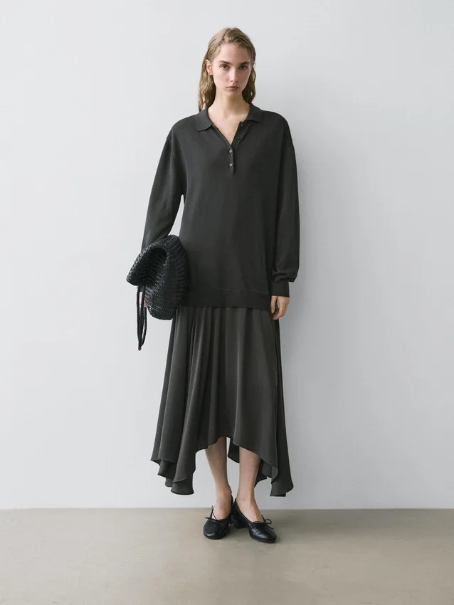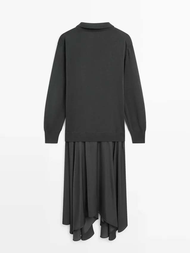 Midiklänning med utställd kjol och stickad överdel. Långa ärmar. Polokrage med knäppning.