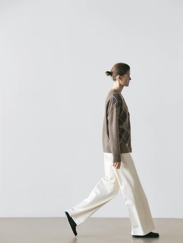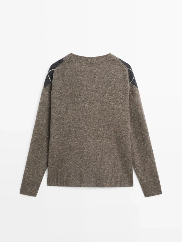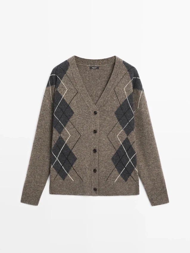 Koftor i ullstickat. V-ringning. Långa ärmar. Knappstängning. Diamantmönster.