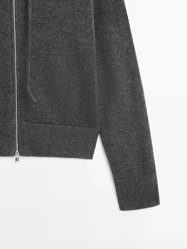 Stickad kofta i ullblandning. Långa ärmar. Dragkedja. Hals med huva och justerbara elastiska dragband.