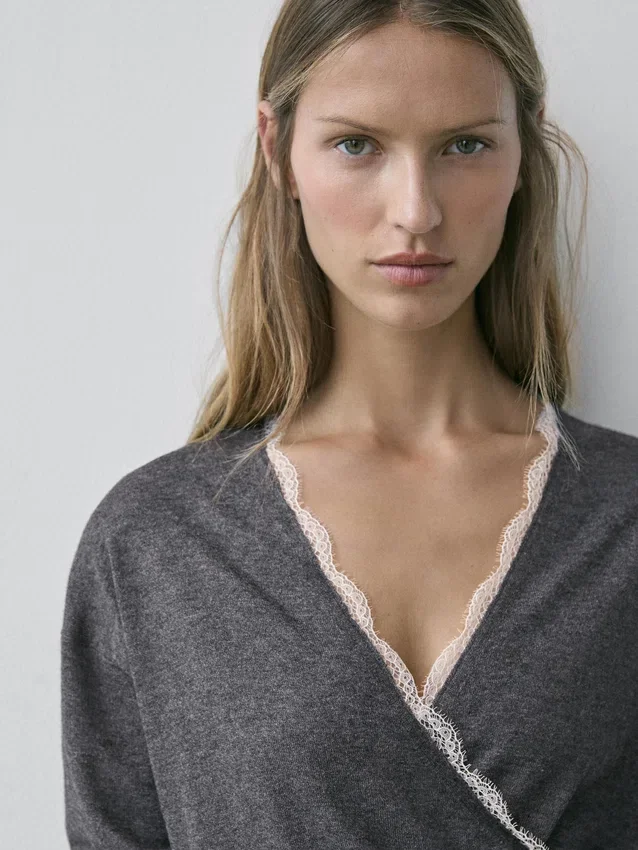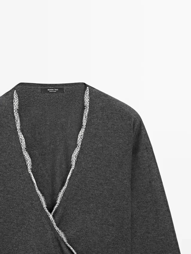 Korslagd stickad koftor med spetsdetaljer