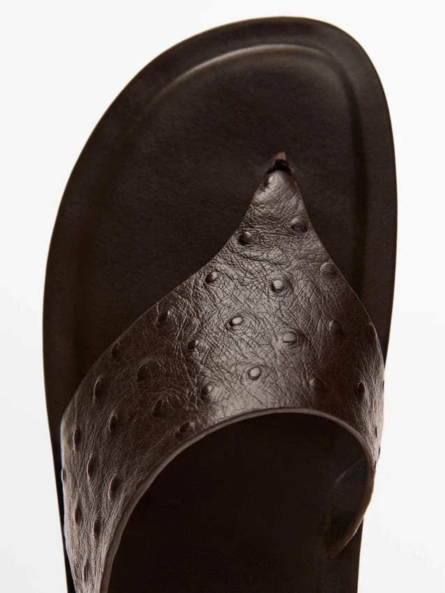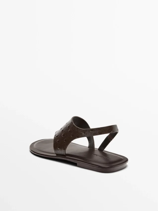 Platta sandaler med glidfötter tillverkade av fårskinn. Elastisk rem baktill. Foder och innersula i läder. Präglad läder med djurmönster. Tåseparator. Lädersandaler.