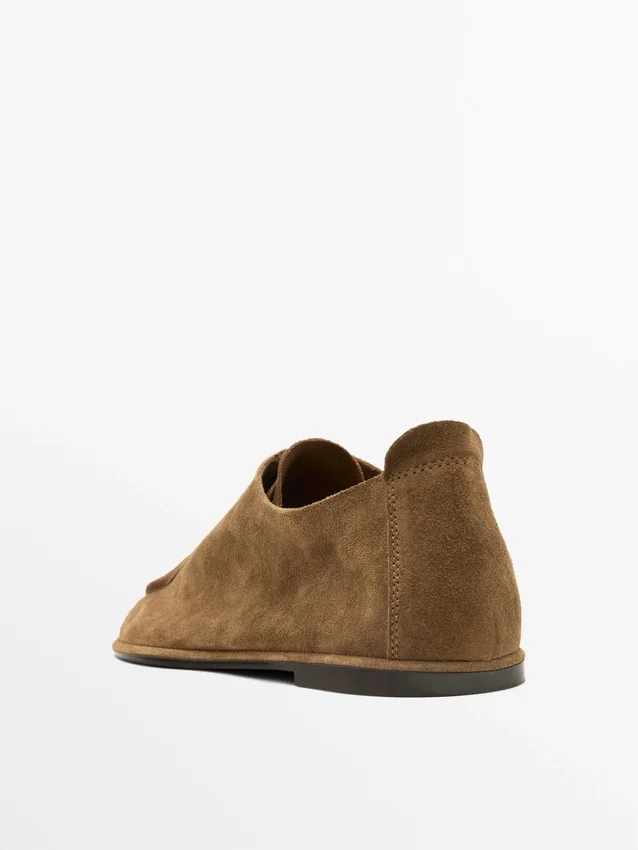 Tillverkade av nötläder med mockafinish. Mjukt läder. Två snörhål. Dragflik baktill för att enkelt kunna ta på sig skorna. Moccasin-tå.