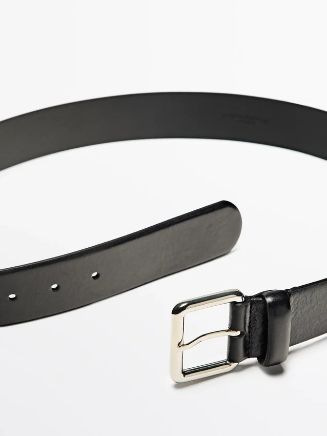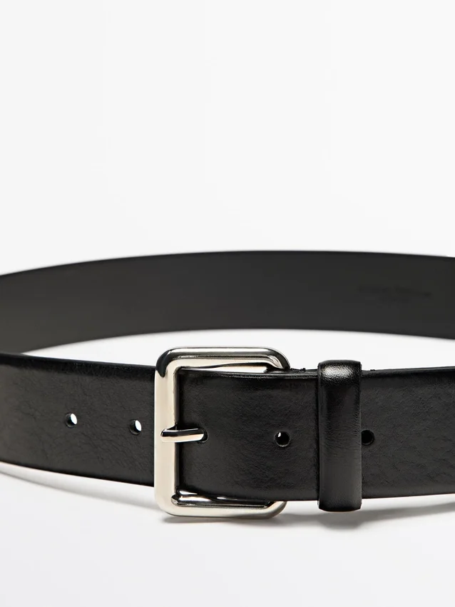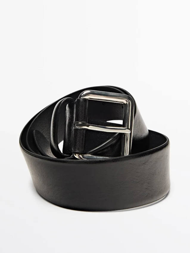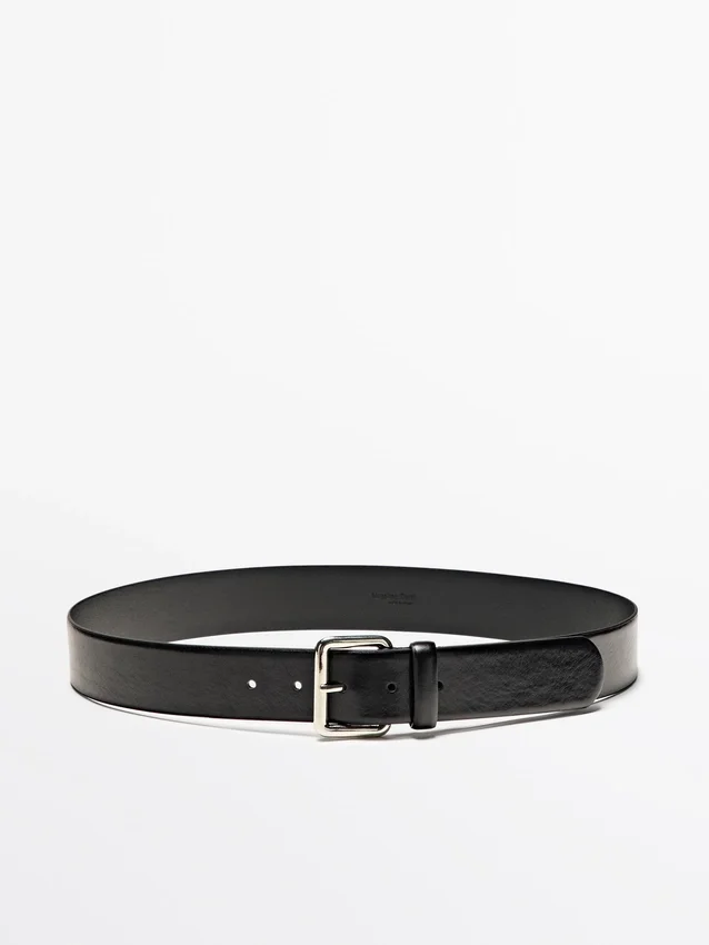 Skärp tillverkat av nötläder med nappa-finish. 4 cm brett. Fyrkantigt metallspänne.