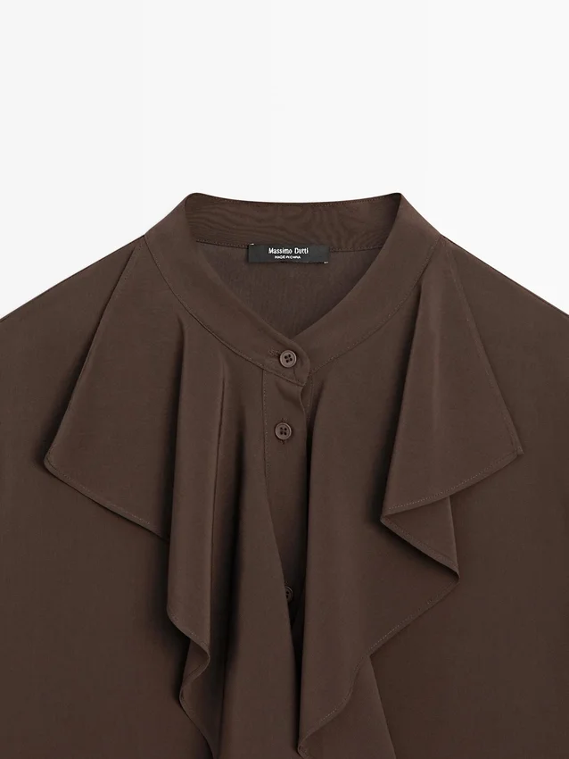 Flödande blus med långa ärmar. Ståkrage. Knäppning fram. Volangdetaljer.