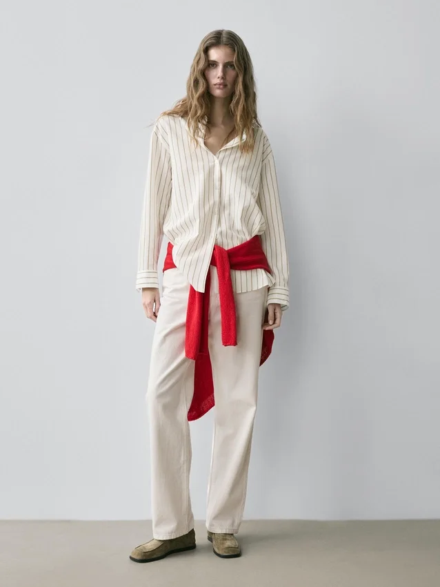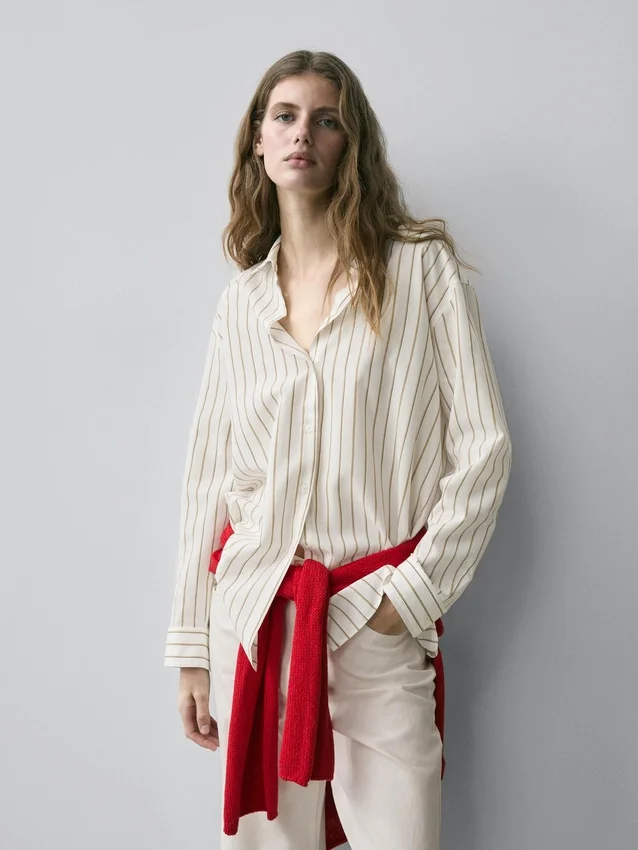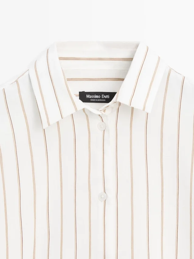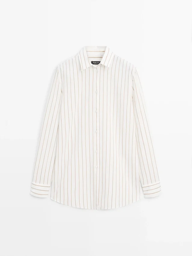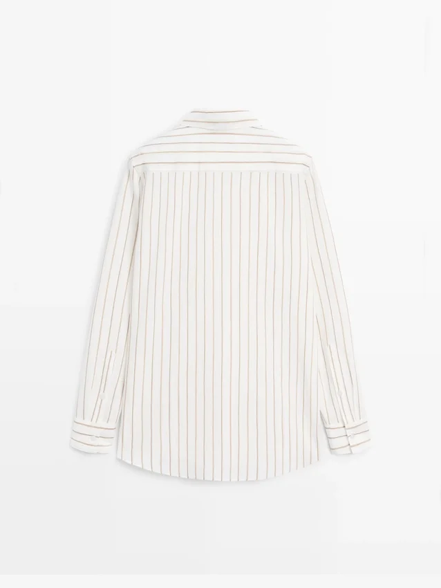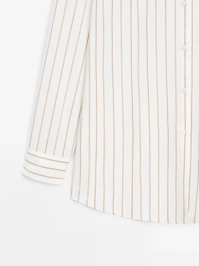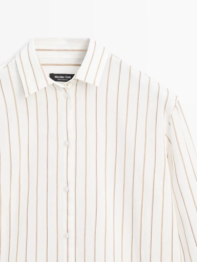 Skjorta i viskosblandning. Långa ärmar med knäppta manschetter. Skjortkrage. Knäppning fram. Randiga detaljer.