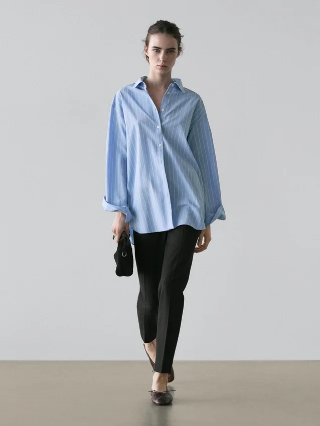 Långärmad skjorta. Skjortkrage. Knäppta manschetter. Knäppning fram. Randigt tryck.