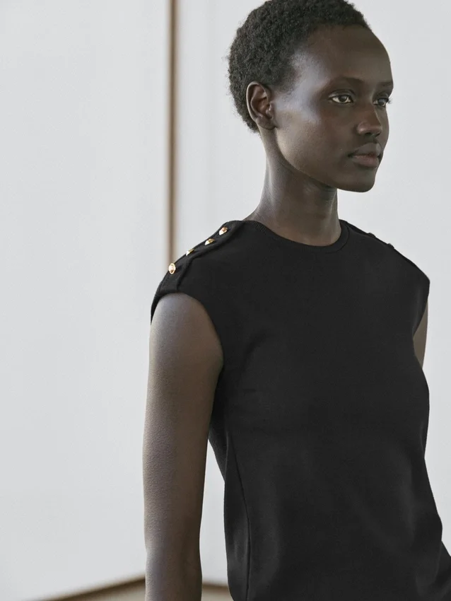 T-shirt tillverkad av ett viskosblandat tyg. Rund hals. Droppärmar. Knappdetalj på axeln.