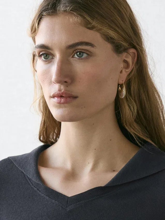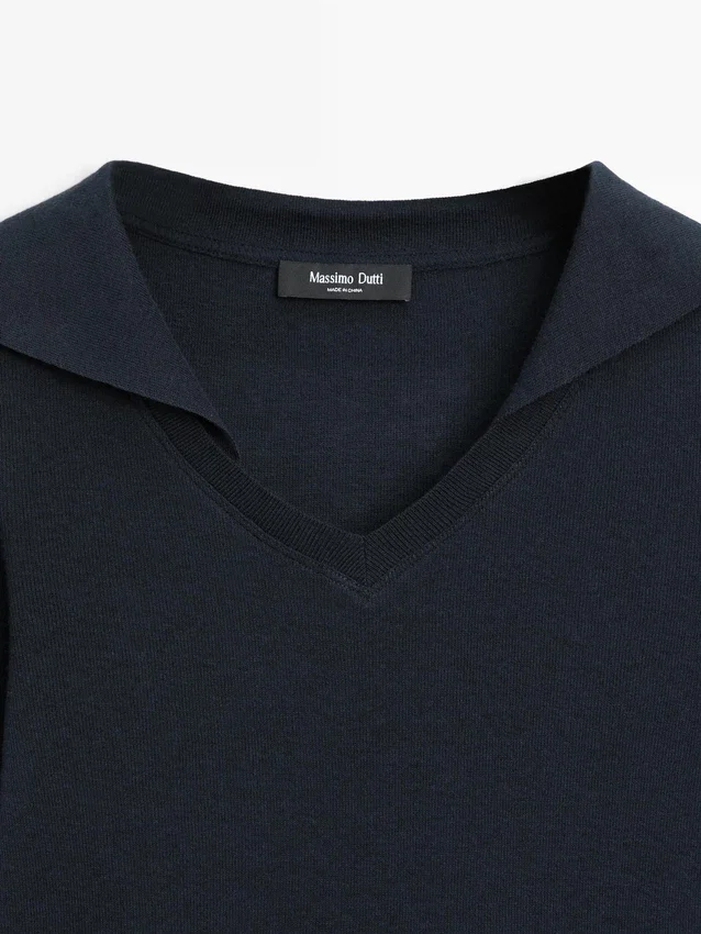 Pikétröja tillverkad av stickat bomullsblandat tyg. Något figursydd silhuett som ger ett mer definierat och smalt utseende. Krage med spetsiga slag. Långa ärmar. Fint, lätt tyg.