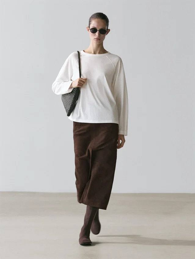 T-shirt i bomull. Rund hals. Långa ärmar. Lätt, mjukt tyg med marmorerad effekt och oregelbunden struktur.