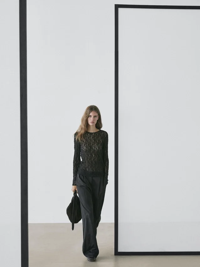 Långärmad topp med spetsdetaljer. Något figursydd silhuett som ger en mer definierad och smal look. Rund hals. Halvtransparent tyg.