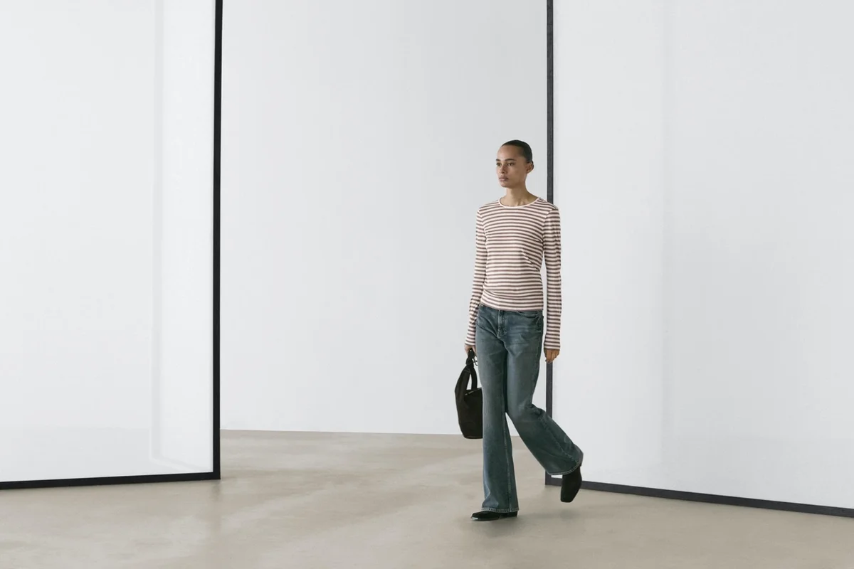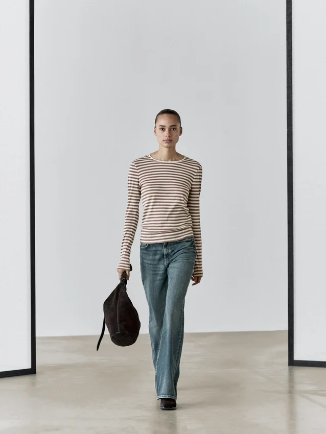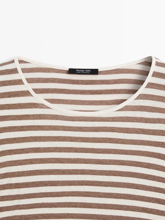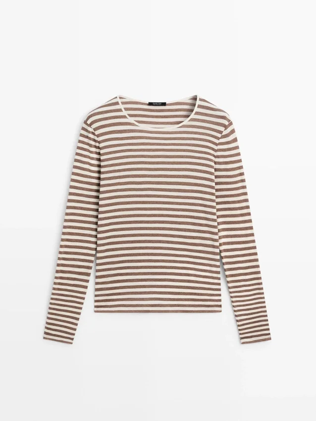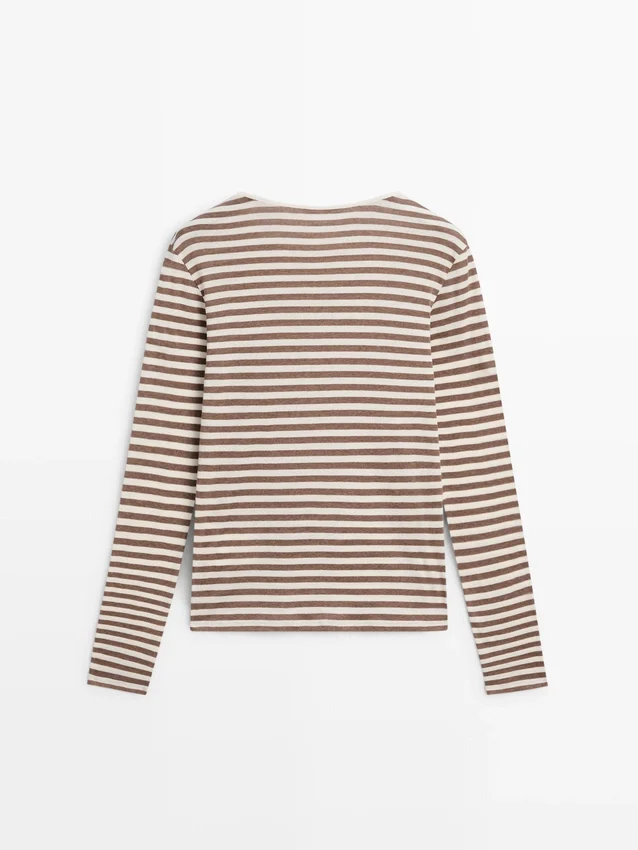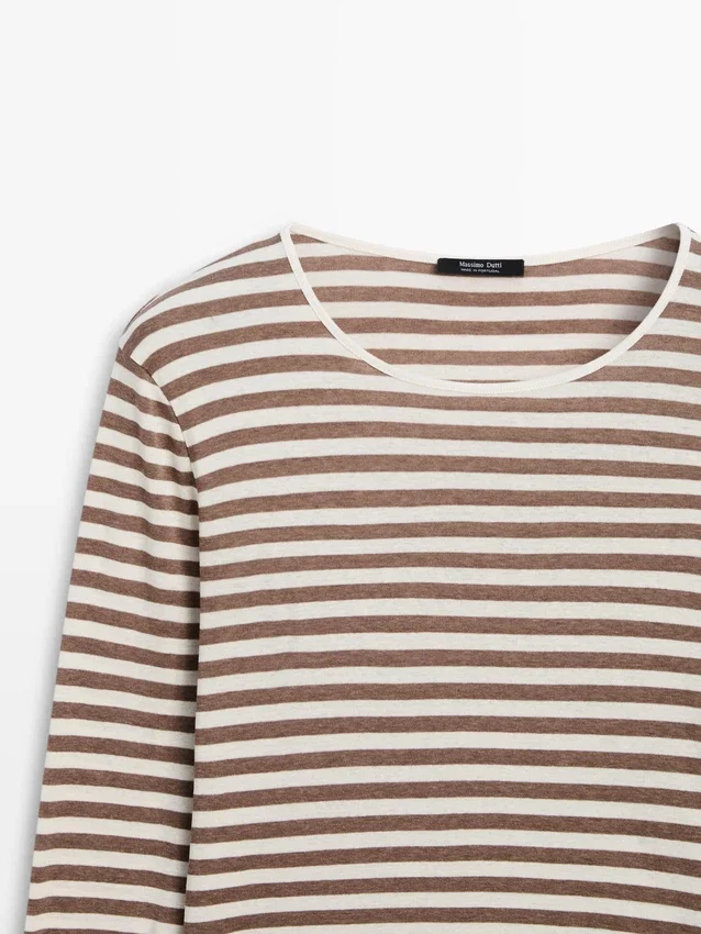 T-shirt tillverkad av bomull. Rund hals. Långa ärmar. Randiga detaljer.