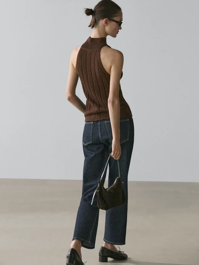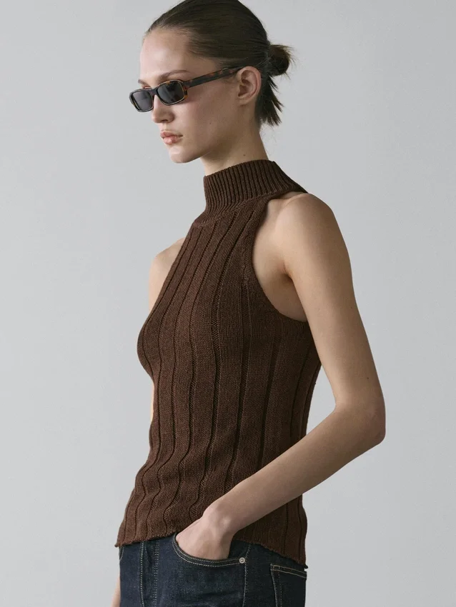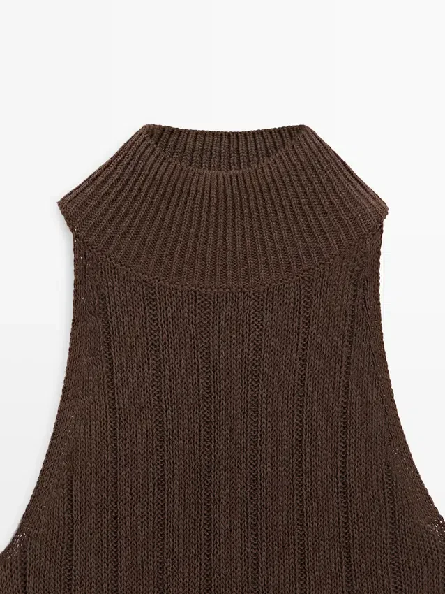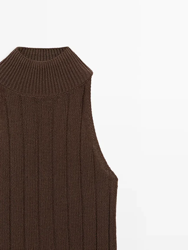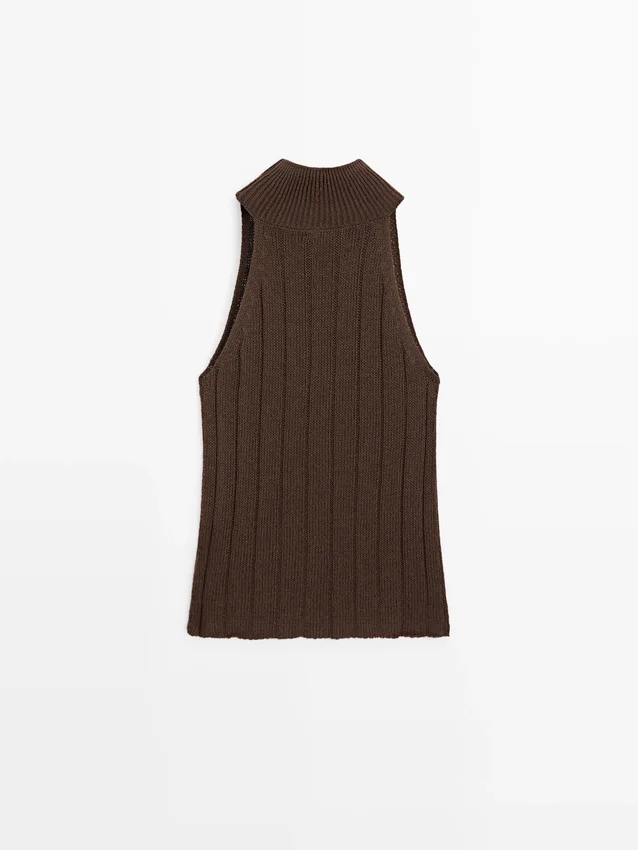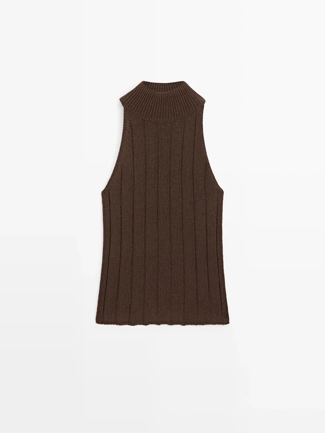 Haltertop. Hög hals. Ärmlös. Ribbat tyg.