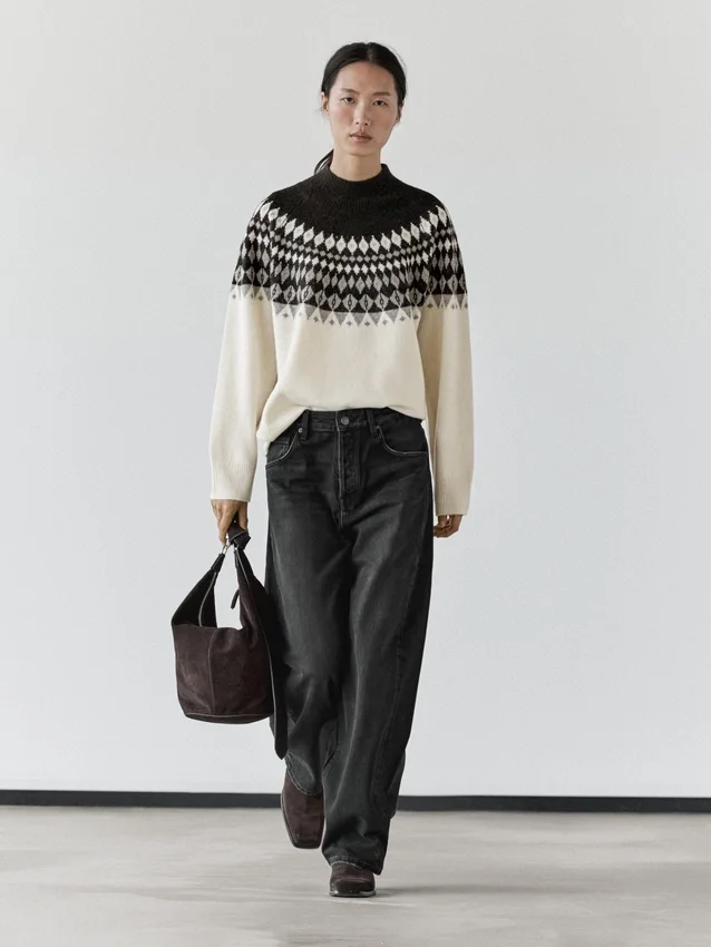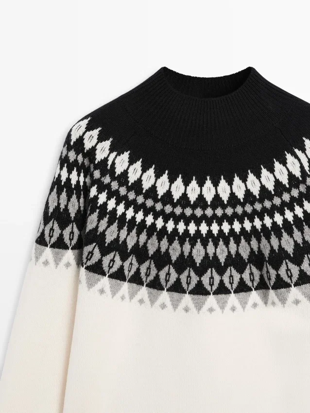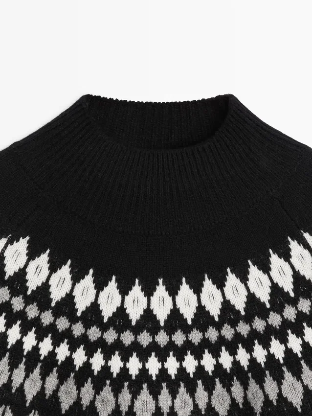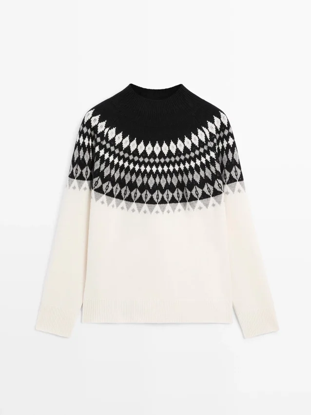 Stickad tröja tillverkad av ett tyg i ullblandning. Hög rund hals. Långa ärmar. Jacquardmönster. Ribbade kanter.