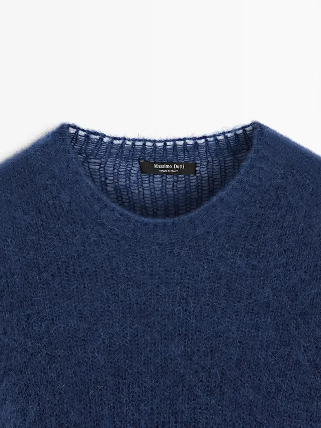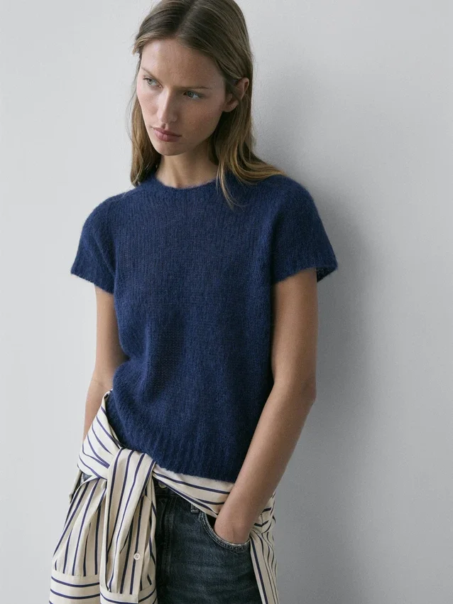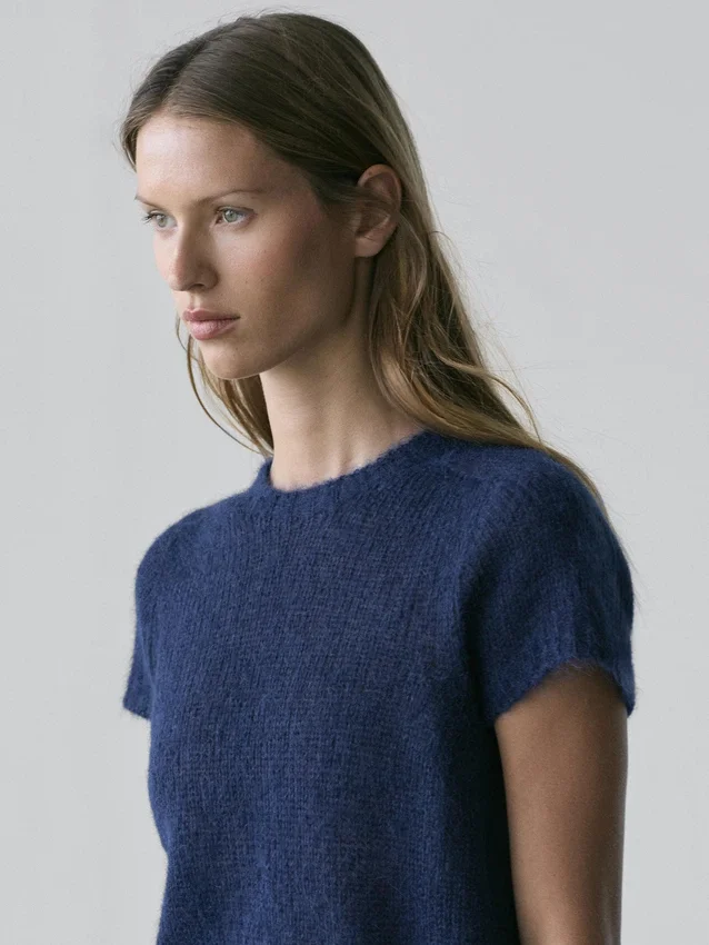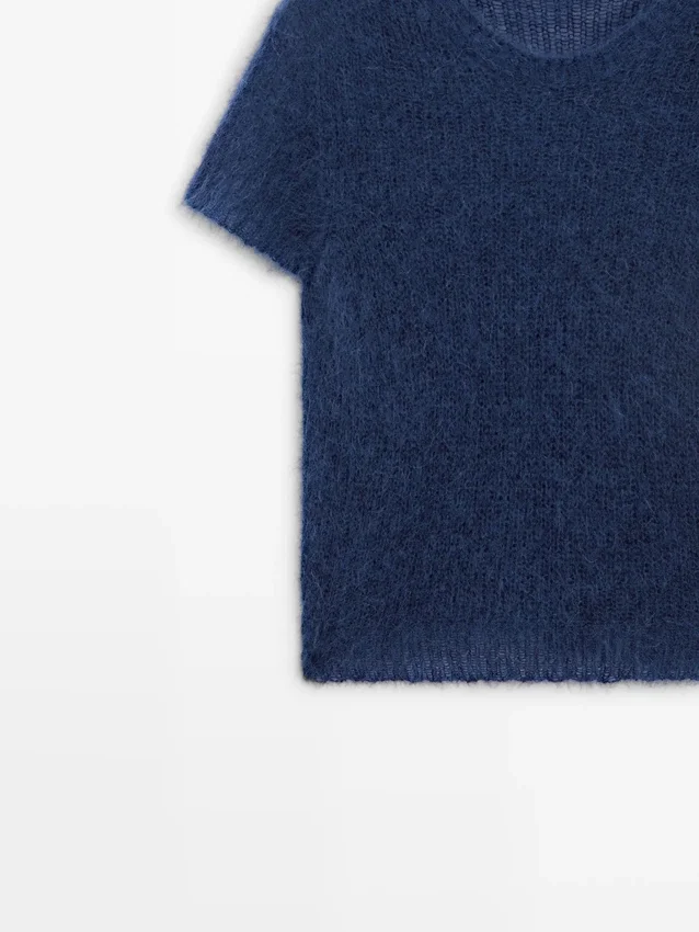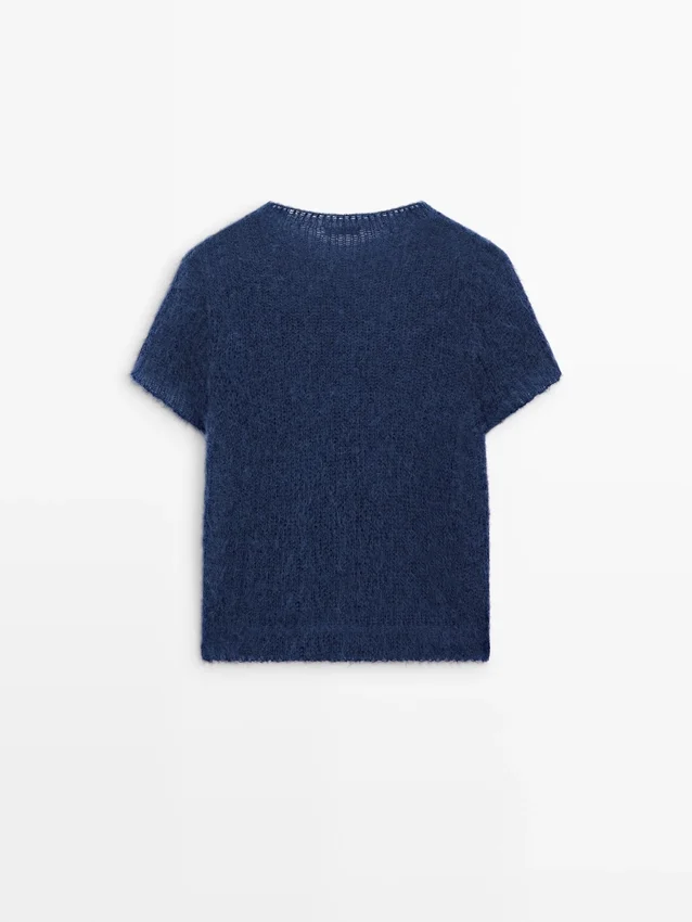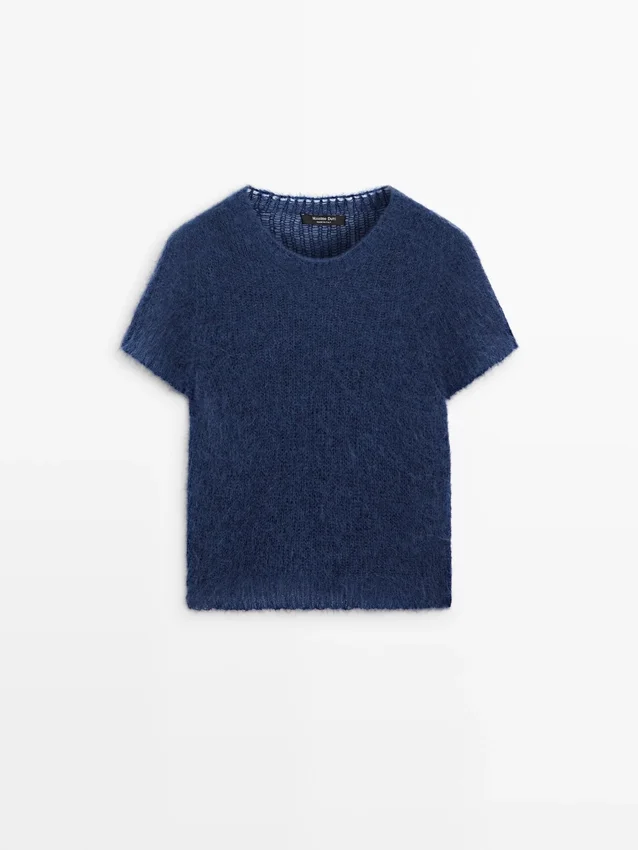 Stickad tröja tillverkad av alpaca-blandat tyg. Rund hals. Korta ärmar.