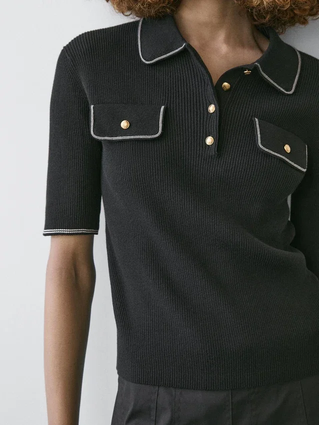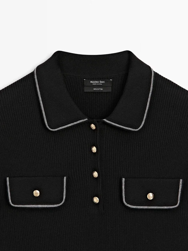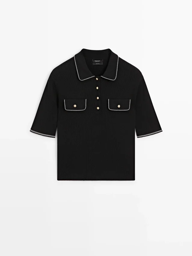Pikétröja tillverkad av 100 % bomullstrikå. Korta ärmar. Guldknappar med diamantform på halsen. Två påsydda fickor med knappar på bröstet. Kontrasterande pipingdetaljer.