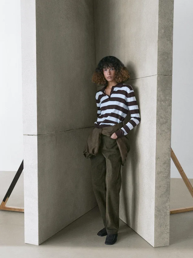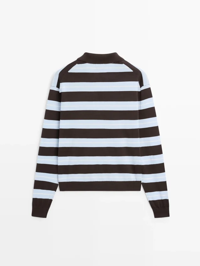 Stickad tröja tillverkad av bomullstyg. Långa ärmar. Polokrage med knappknäppning. Randigt mönster.