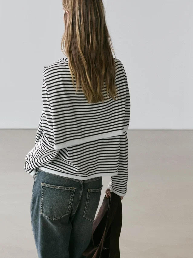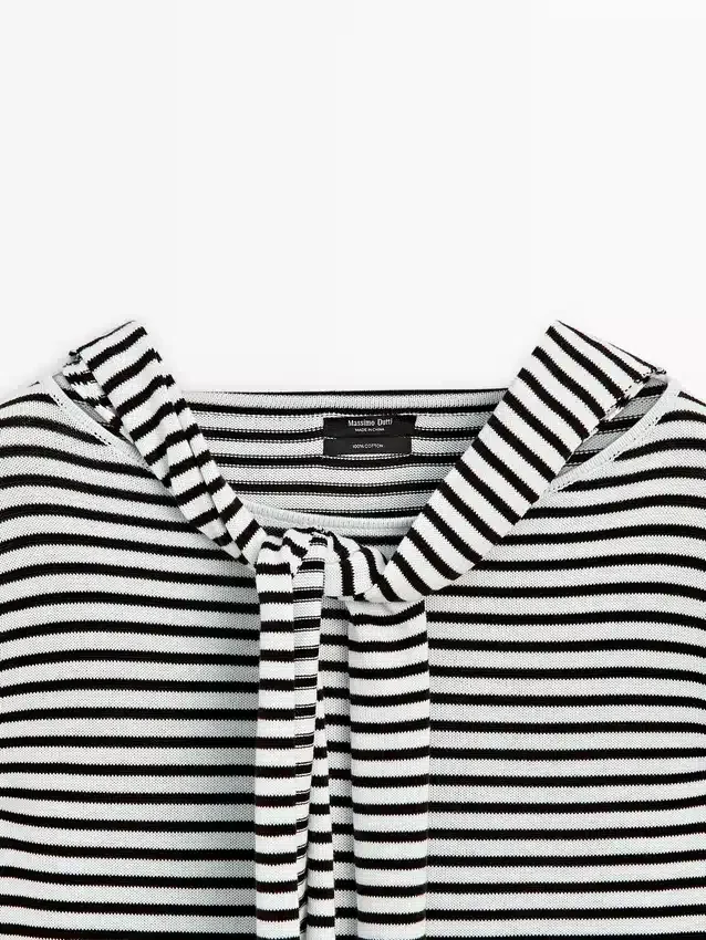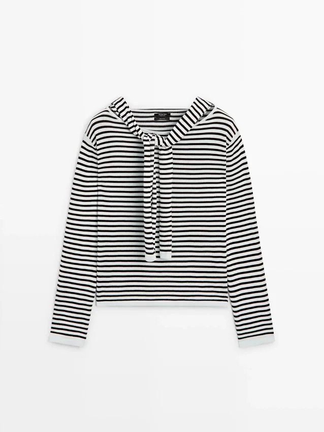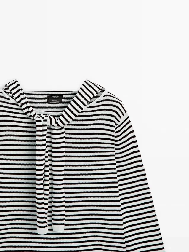 Stickad tröja tillverkad av bomullstyg. Rund hals. Långa ärmar. Randigt tryck. Ärmar med flera lägen.