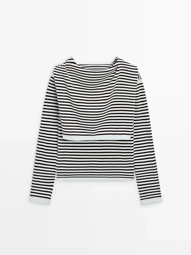 Stickad tröja tillverkad av bomullstyg. Rund hals. Långa ärmar. Randigt tryck. Ärmar med flera positioner.