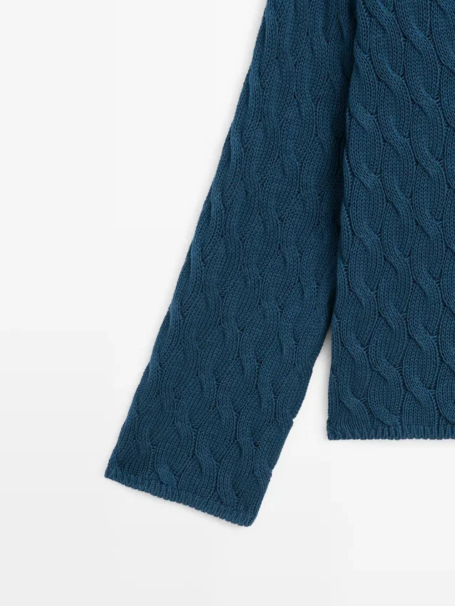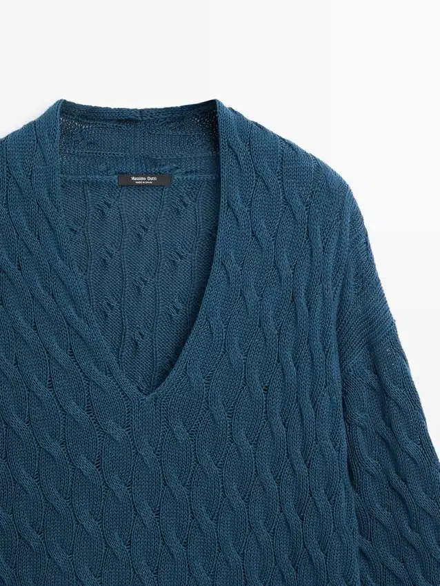 V-ringning. Långa ärmar. Ribbade kanter. Flätade detaljer.