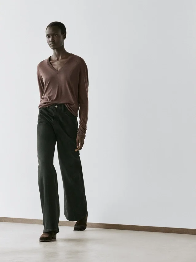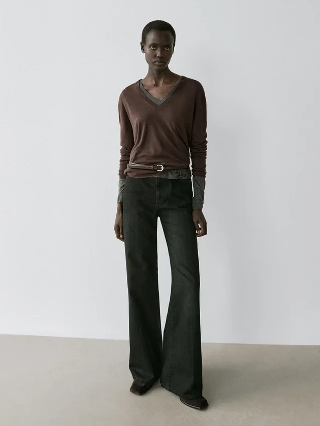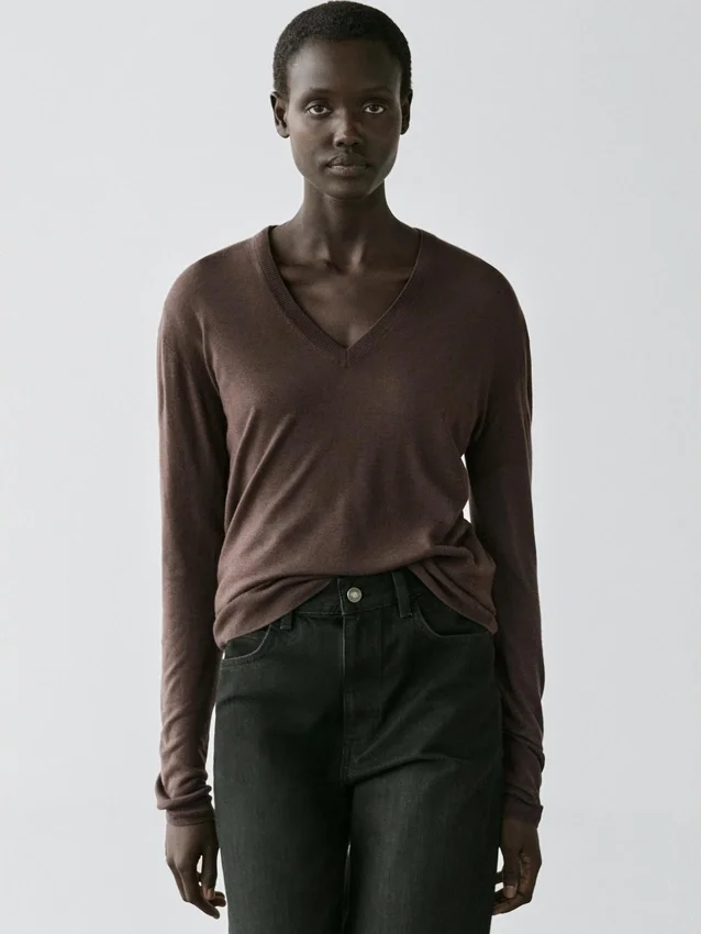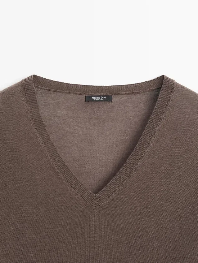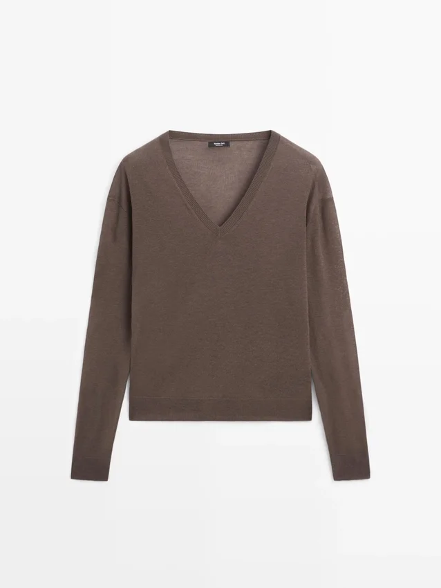 Tröja tillverkad av en stickad blandning av siden och ull. V-ringning. Långa ärmar. Ribbade kanter. Mjukt tyg som är behagligt att ta på.