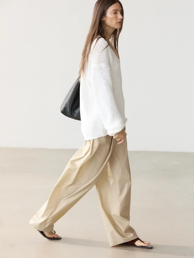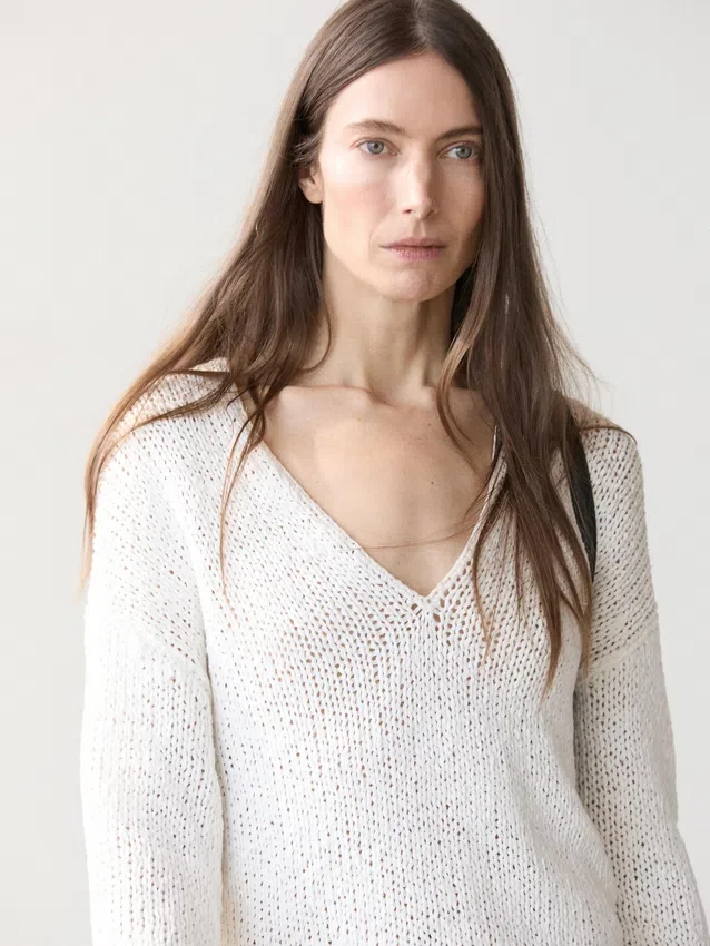Stickad tröja i bomullsblandning. V-ringning. Långa ärmar. Genombrutet tyg.