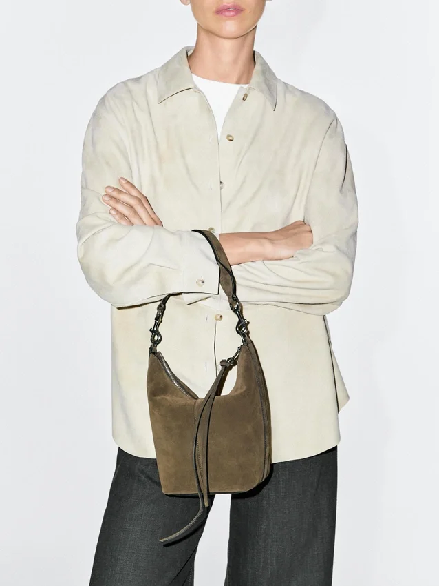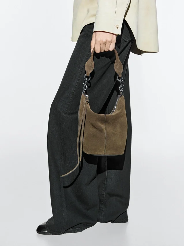 Handväska tillverkad av nötläder med en yta av spaltläder. Ett handtag/axelrem. Dragkedja. En innerficka. Huvudfack. Stängs med läderflik.