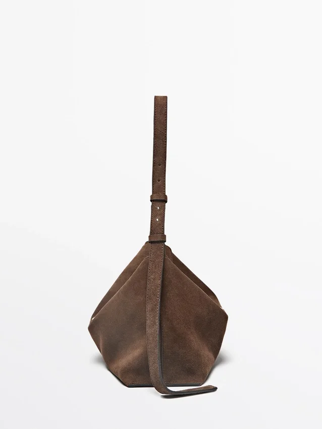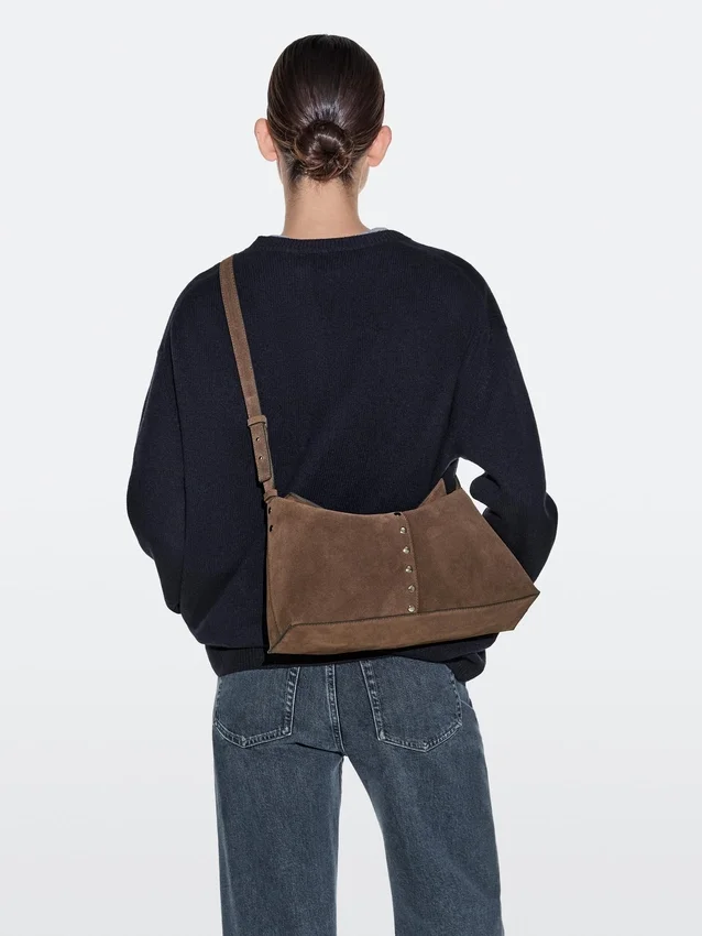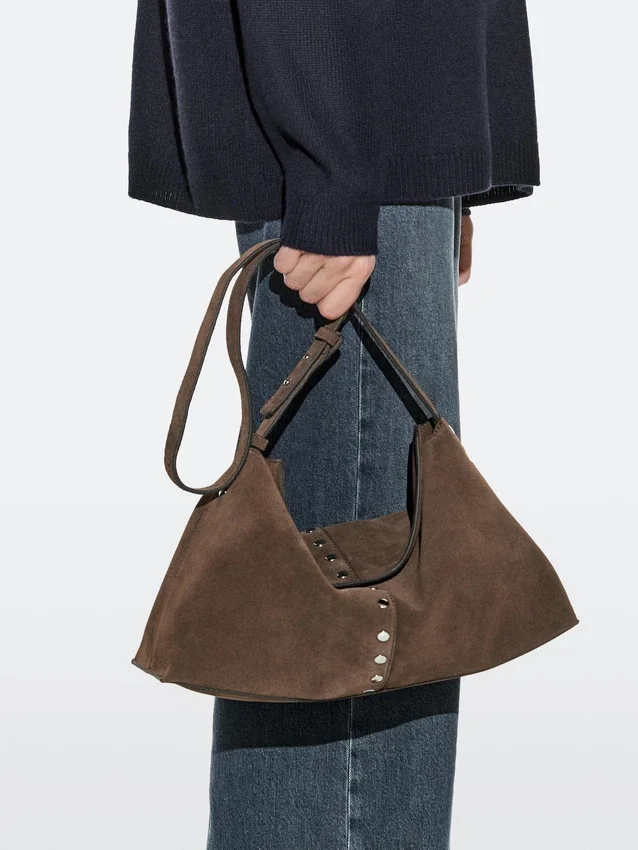 Handväska tillverkad av kohud med en yta av spaltat läder. Justerbar axelrem. Stängning med magnetknapp. En innerficka. Bomullsfoder. Detaljer med metallnitar.