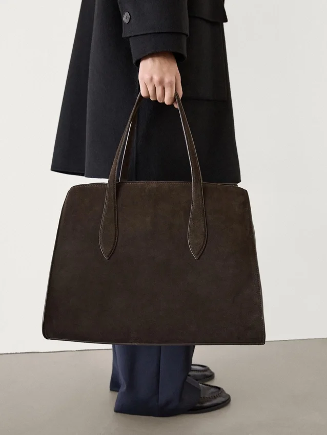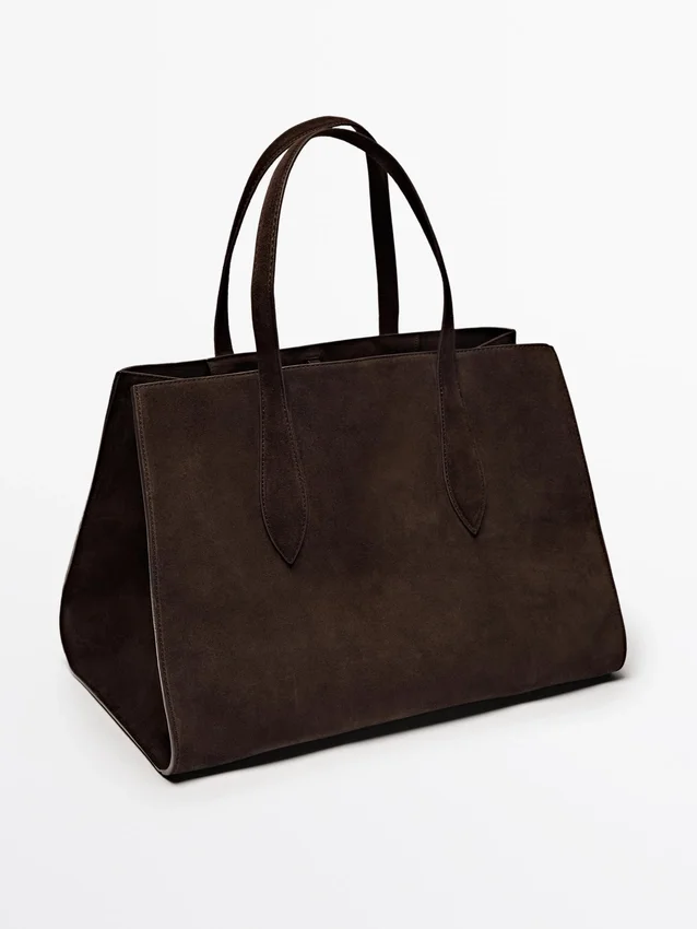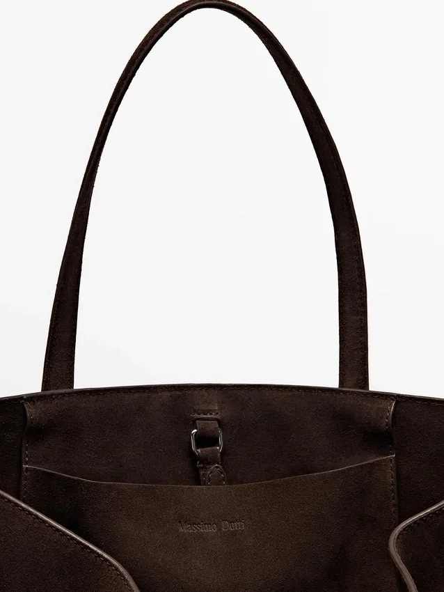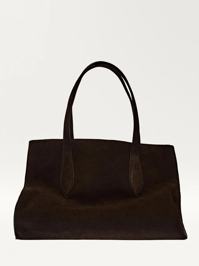 Maxi-tote-väska med spänne på insidan. En ficka för kort. Två handtag och axelremmar. Huvudfack. Fodrad. Tillverkad av nötläder.