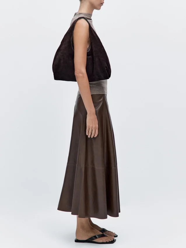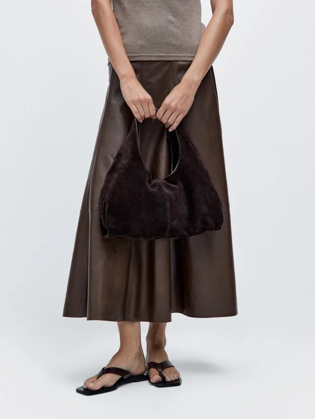 Handväska tillverkad av nötläder med en yta av spaltläder. Ett handtag/axelrem. Magnetisk tryckknappsförslutning. En innerficka. Bomullsfoder.
