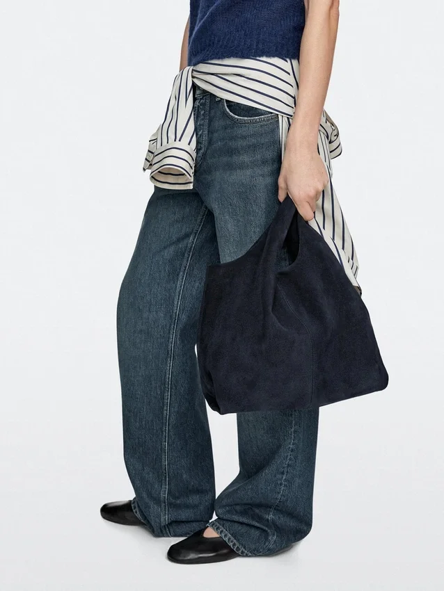 Tote-väska. Magnetisk tryckknappsförslutning. Två handtag och axelremmar. Bomullsfoder. Tillverkad av kohud med splitläderfinish.