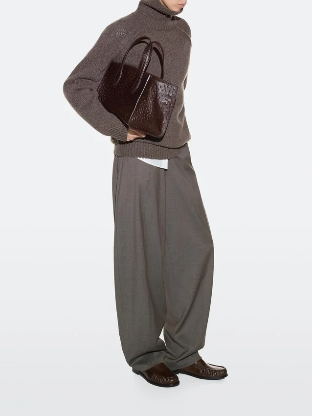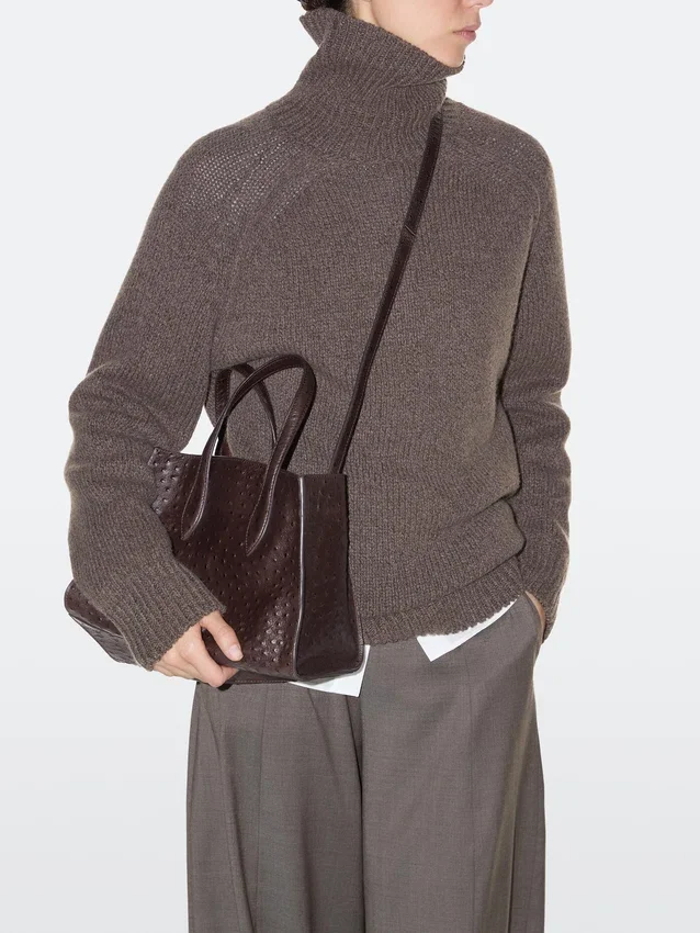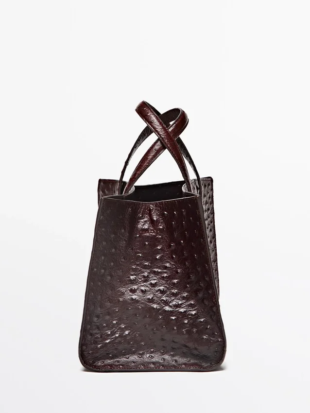 Handväska tillverkad av nötläder med detaljer i fårskinn. Justerbar och avtagbar axelrem. Två handtag. Bomullsfoder. Läderdetaljer med strukturerad yta.